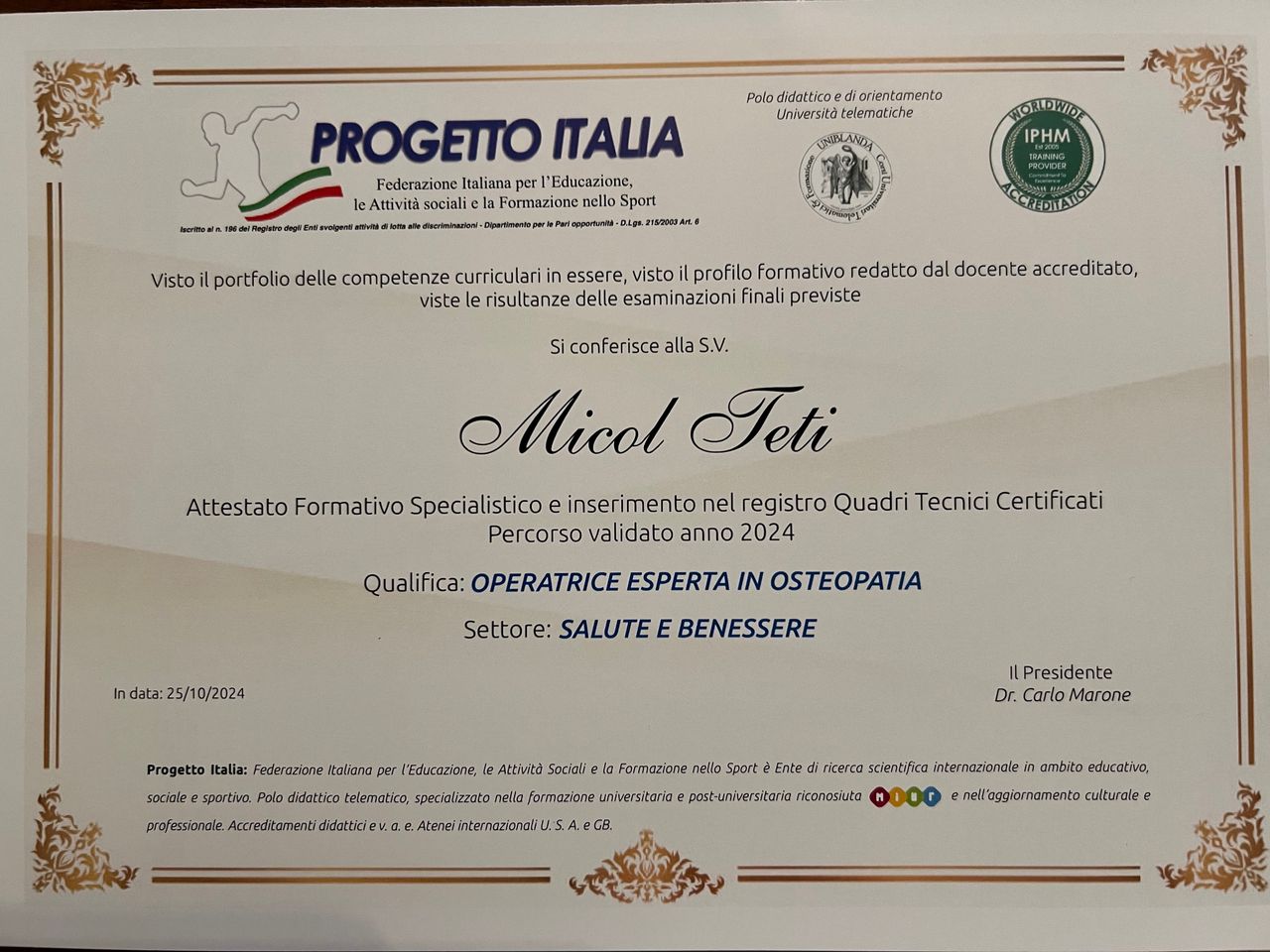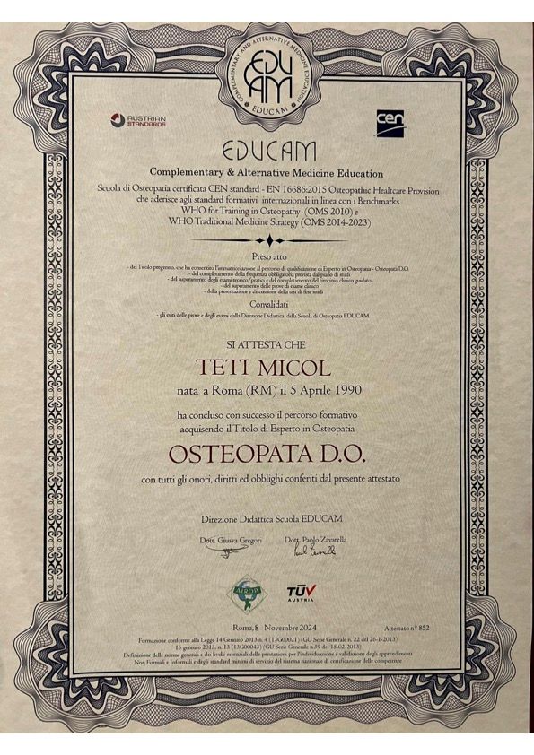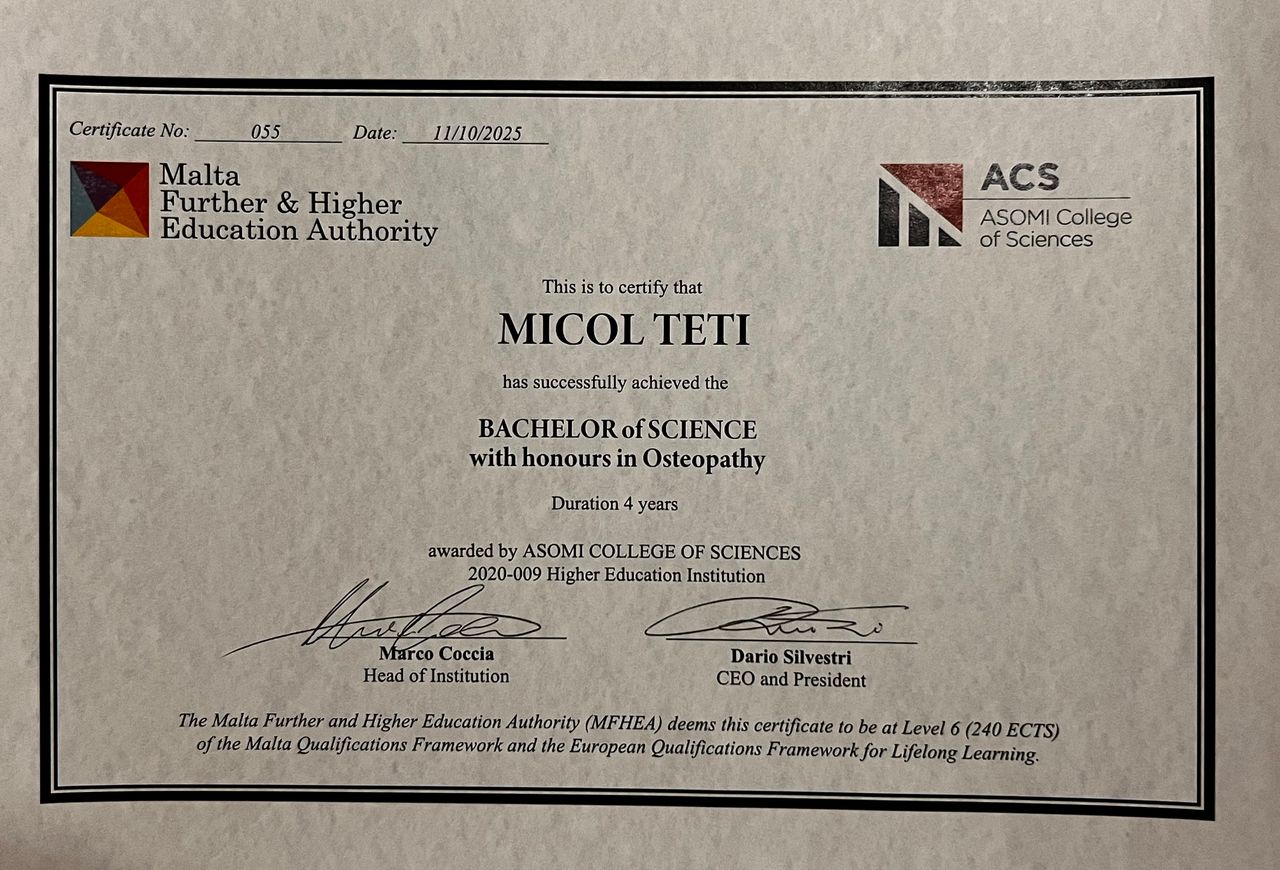 Mi presento, sono Micol Teti Osteopata D.O., laureata in Osteopatia presso ASOMI College of Sciences di Malta con il titolo di Bachelor of Science in Osteopathy e diplomata in Osteopatia presso la scuola EDUCAM.