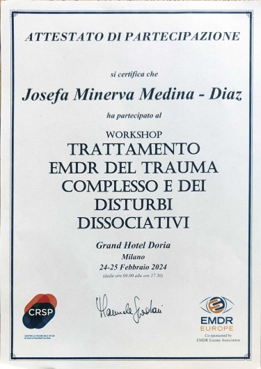 Ho cominciato da poco un percorso psicoterapeutico con la Dottoressa Minerva Diaz. Già dalla prima seduta conoscitiva sono rimasta stupita sia dalla professionalità e bravura come Dottoressa, che dai modi dolci, gentili ed empatici a livello umano. Sono una persona che fatica tanto a sentirsi a proprio agio ma con la Dottoressa sento come se avessi davanti a me una figura familiare e sicura. Ad ogni seduta sento che l'EMDR sta funzionando, riesco a sentire fisicamente sensazioni in tutto il corpo. Al momento ho fatto solo 4 sedute ma già mi sento molto meglio rispetto a quando ho cominciato, è come se mi si fosse sbloccato qualcosa dentro che mi sta aiutando ad accettare e comprendere ciò che non va. È stata una bella scoperta l'EMDR e credo sia un approccio che fa al caso mio. La Dottoressa è davvero fantastica sia come persona che come professionista e mi sento di consigliare vivamente un percorso con lei se si vuole cominciare a stare meglio già dalle primissime sedute.