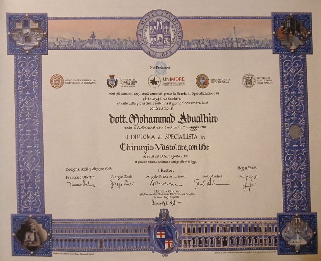 Sono un Chirurgo Vascolare specializzato all'Università di Bologna con esperienza lavorativa per più di 8 anni e vasta casistica chirurgica in Ospedale Maggiore e Ospedale S.Orsola- Malpighi di Bologna.