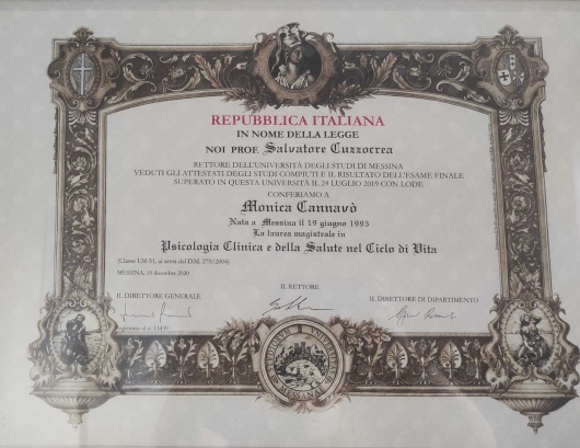 La Dottoressa offre, presso il proprio studio a Messina, consulenze psicodiagnostiche e sostegno psicologico per: disturbi d'ansia, disturbi dell'umore, dipendenze affettive, abuso, problematiche relazionali e difficoltà legate allo sviluppo dell'identità personale.