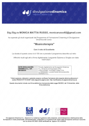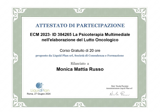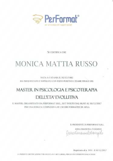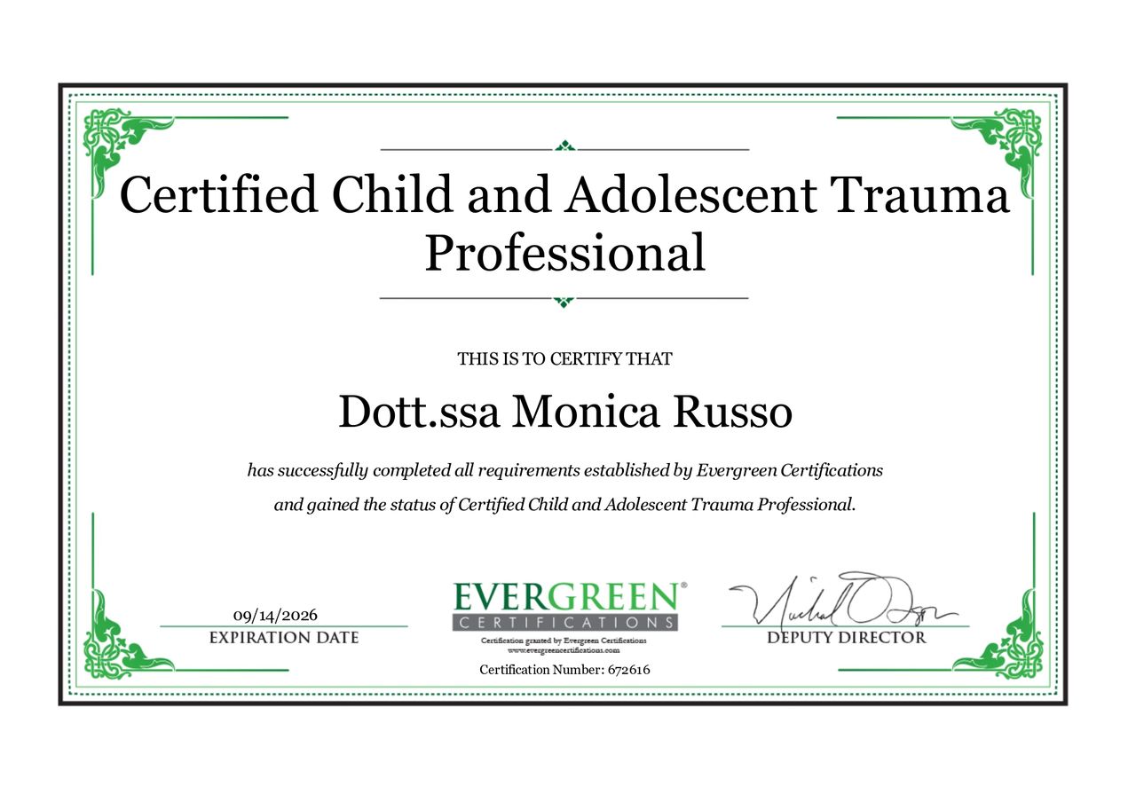 Psicoterapeuta Analitico-transazionale, Esperta in Infanzia e Adolescenza, Certificazione di professionista del trauma infantile e adolescenziale (CATP), facilitatore mindfulness, conoscenza di tecniche di musicoterapia.