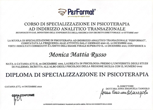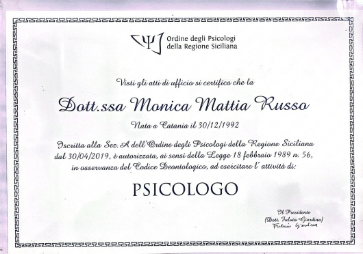La psicologia ha sempre suscitato un certo fascino su di me, così come il desiderio di riuscire ad “aiutare”, non tanto partendo da indicazioni o consigli miei personali, quanto aiutando l’altro a riconoscere le proprie risorse e potenziarle fino a raggiungere i propri obiettivi. E questo è sempre stato, in qualche modo, il mio scopo nel corso dei miei studi. È stato sempre più chiaro per me che il mio interesse si focalizza sulla fase evolutiva dell’essere umano, di conseguenza ho deciso di seguire un corso universitario specifico, conseguendo la laurea nel 2017 in un’Università fuori dalla mia città in Psicologia Clinica dell’Arco di Vita, che mi ha permesso di formarmi non solo nell’ambito psicologico in generale, ma anche in particolare per quanto concerne l’infanzia e l’adolescenza. Per questo motivo nel 2018, nel corso del mio tirocinio formativo presso l’ASP affiancata alla psicologa della sezione di Neuropsichiatria infantile, ho svolto anche il master in Psicologia e Psicoterapia dell’infanzia e dell’adolescenza. Inoltre attraverso i miei studi teorici ho avuto modo di confermare che il mio interesse si indirizza maggiormente verso l’ambito psicotraumatico e l’utilizzo della musicoterapia, considerazione che avevo già precedentemente assaporato nel corso della mia crescita professionale. In seguito alla mia abilitazione professionale come Psicologa ho deciso di svolgere un anno di servizio civile presso il reparto di Oncologia e di Radioterapia. Questa esperienza mi ha fatto molto avvicinare nella pratica al mondo della psicologia degli adulti. In seguito mi sono iscritta alla scuola di psicoterapia Analitico-transazionale, e, come speravo ed aspiravo, tale percorso mi ha aiutato a darmi il permesso di migliorarmi professionalmente come futura psicoterapeuta impegnando nella relazione con gli altri tutta la mia persona, con tutto ciò che vi appartiene.