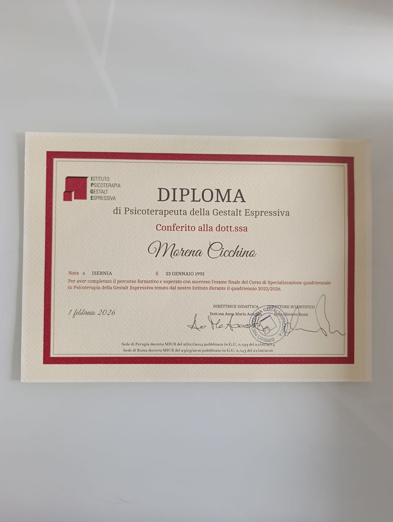 Salve a tutti, sono la dott.ssa Morena Cicchino, Psicologa, Psicoterapeuta della Gestalt Espressiva ed Arteterapeuta.