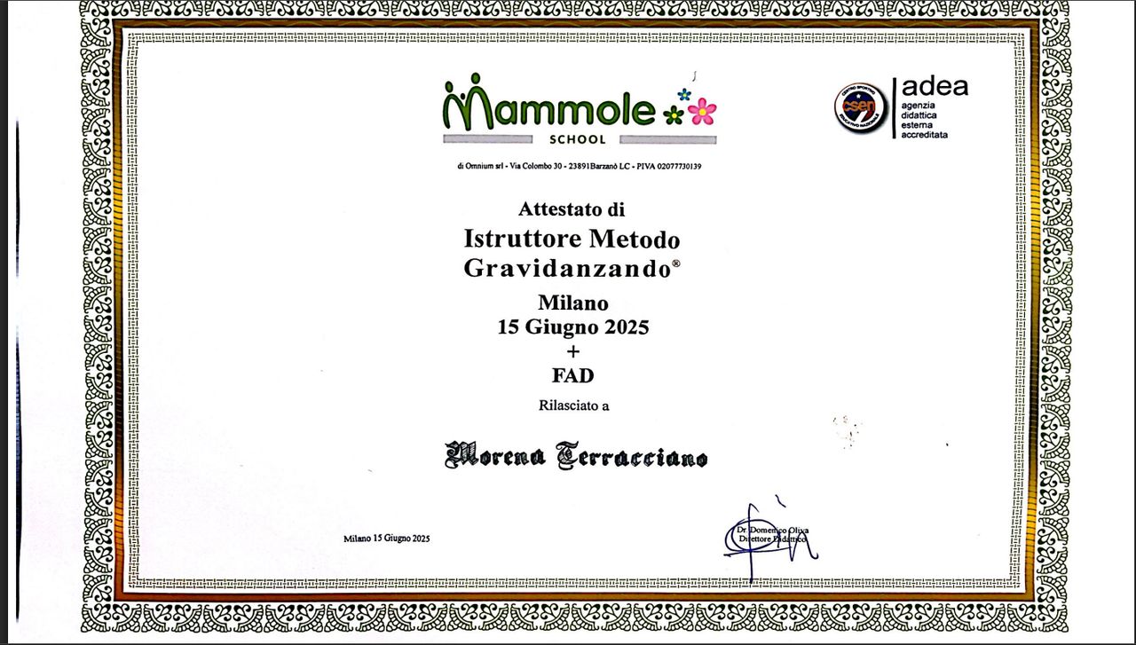 • Pratica del metodo Gravidanzando, che unisce movimento, musica e benessere per prepararsi al parto in modo armonioso.