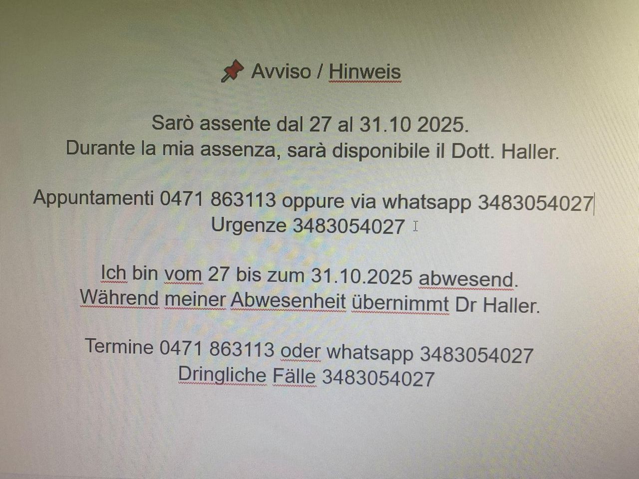 Um einen Termin zu vereinbaren oder für Anfragen, lade ich Sie ein, die App „Mio Dottore“ (Kinderärztin Nadia Beltrami) zu nutzen: