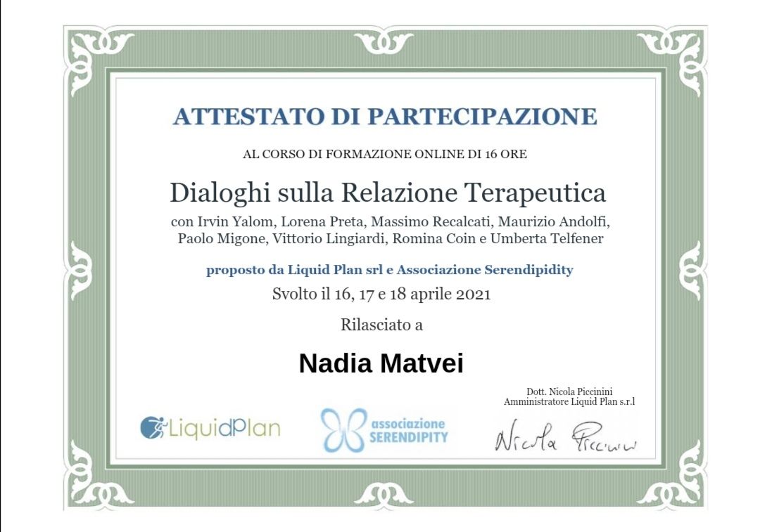 Consiglio vivamente la Dott.ssa Matvei a chiunque stia cercando un supporto serio e umano, capace di fare davvero la differenza nel proprio benessere psicologico.• consulenze online • primo colloquio individuale •