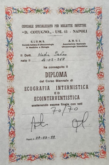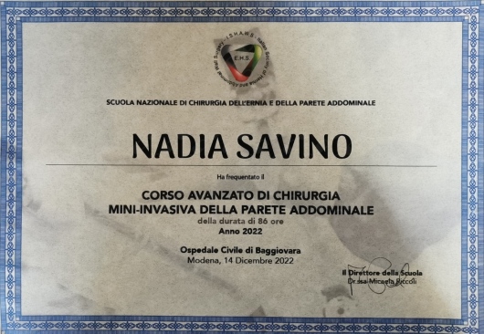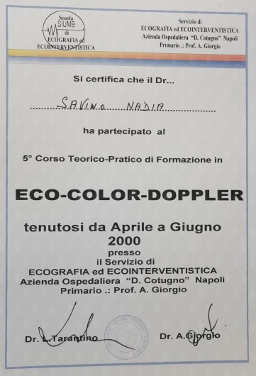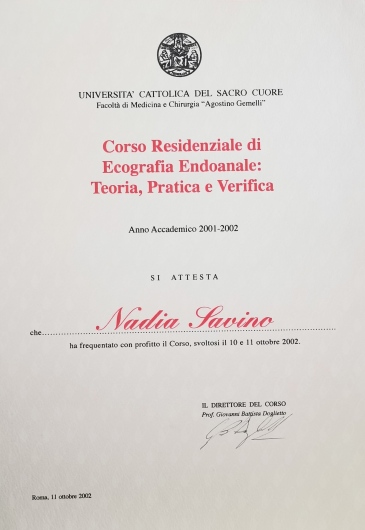 Ho frequentato vari corsi tra cui quello di Ecografia Internistica, Eco-Color-Doppler (Ospedale Cotugno di Napoli Scuola SIUMB), Ecografia Endoanale (Universityà Cattolica Gemelli di Roma). Corso Avanzato di Chirurgia Mini-Invasiva di Parete Addominale (Italian Society of Hernia and Abdominal Wall Surgery), Corso della Chirurgia della Parete Addominale A.O.R.N. Cardarelli Società Italiana di Chirurgia.