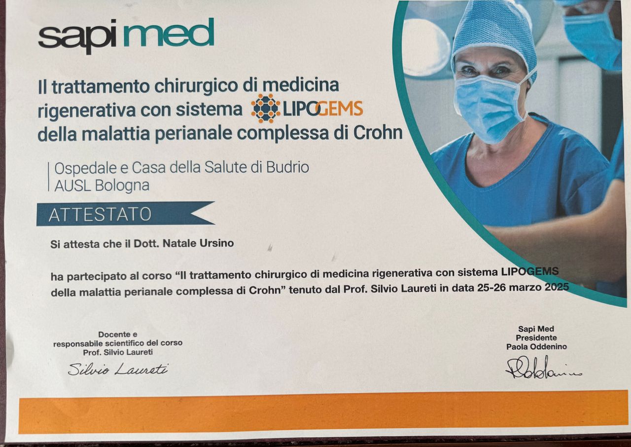 2025 – Bologna: Corso di chirurgia rigenerativa con sistema Lipogems® per la malattia perianale complessa di Crohn (Prof. Silvio Laureti).