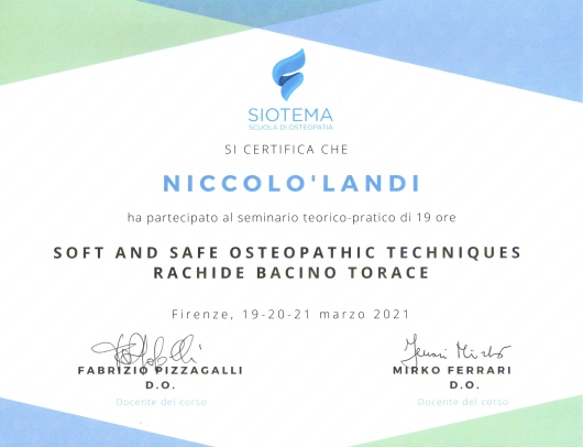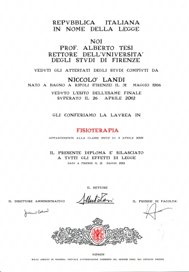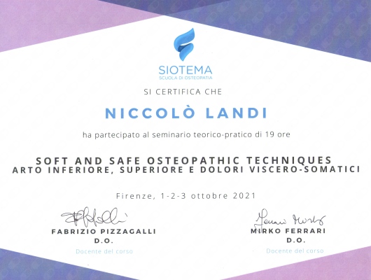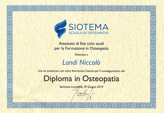 Mi sono laureato in Fisioterapia nel 2012 presso la Facoltà di Medicina e Chirurgia dell'Università degli Studi di Firenze. Già durante il percorso universitario ho maturato l’interesse verso l’osteopatia e nel 2019 ho conseguito il Diploma in Osteopatia (DO) presso SIOTEMA (Scuola Italiana di Osteopatia e Terapie Manuali).