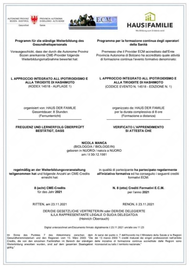 Cordiali saluti, Dott. Nicola Manca, Biologo Nutrizionista e Chinesiologo.