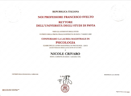 Sono la dott.ssa Nicole Crivaro, psicologa clinica, psicoterapeuta in formazione presso la Scuola di Specializzazione in Psicoterapia ad indirizzo Cognitivo-Comportamentale "Studi Cognitivi" con sede a Genova.