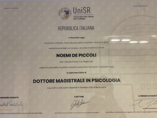 Ho studiato alla Facoltà di Psicologia dell’Università Vita-Salute San Raffaele, dove poi ho continuato la magistrale in Psicologia Clinica. Dopo la Laurea ho proseguito all’Ospedale San Raffaele di Milano per effettuare il tirocinio annuale post laurea nell’area di Psicologia Clinica e della Salute facendo esperienza clinica nell’area oncologica ed esperienze di ricerca nel medesimo ambito. Durante la Pandemia ho potuto anche fare un’esperienza di aiuto e supporto nei reparti Covid dell’Ospedale San Raffaele.