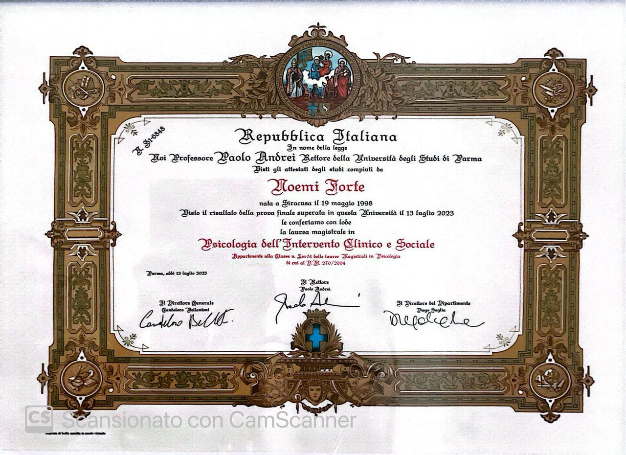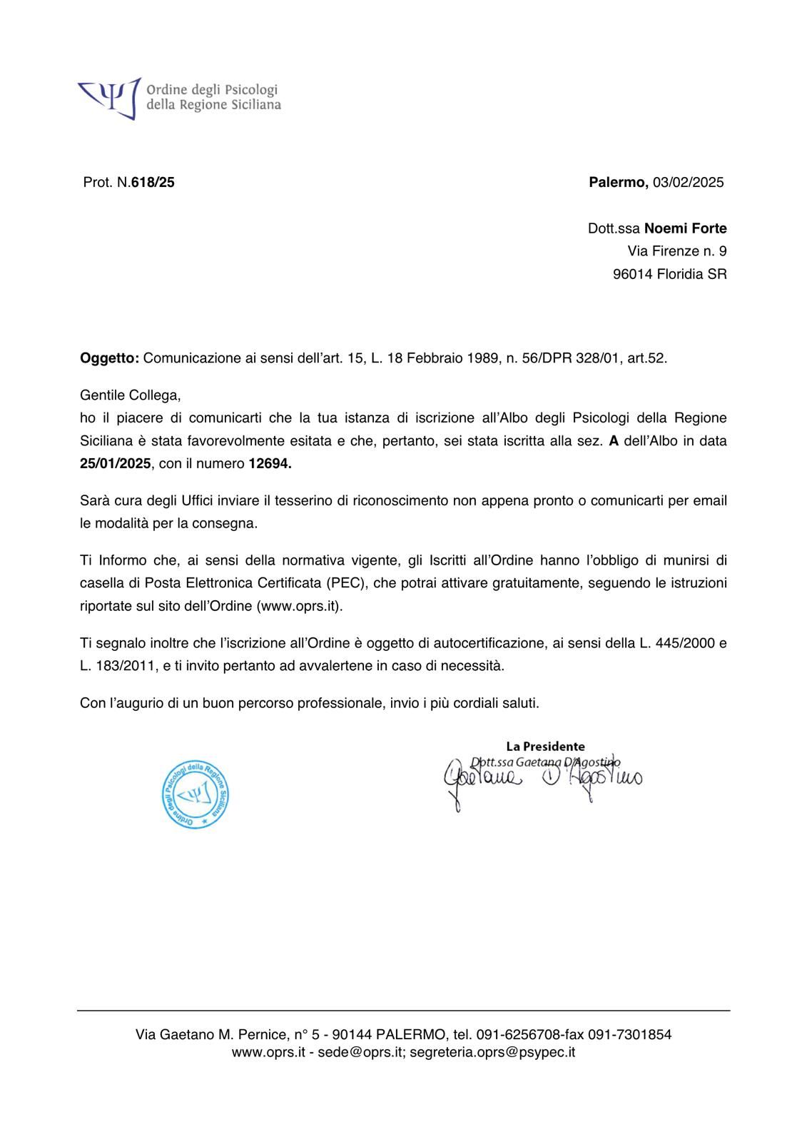 La Dottoressa Noemi Forte é una vera e propria professionista! Con lei mi son sentita subito a mio agio. Trasmette una serenità ed un’empatia che ben pochi riescono a trasmettere. Per non parlare della sua professionalità e preparazione. L’incontro settimanale con lei, é il mio momento preferito, in cui potermi sentire al sicuro. Grazie Dottoressa