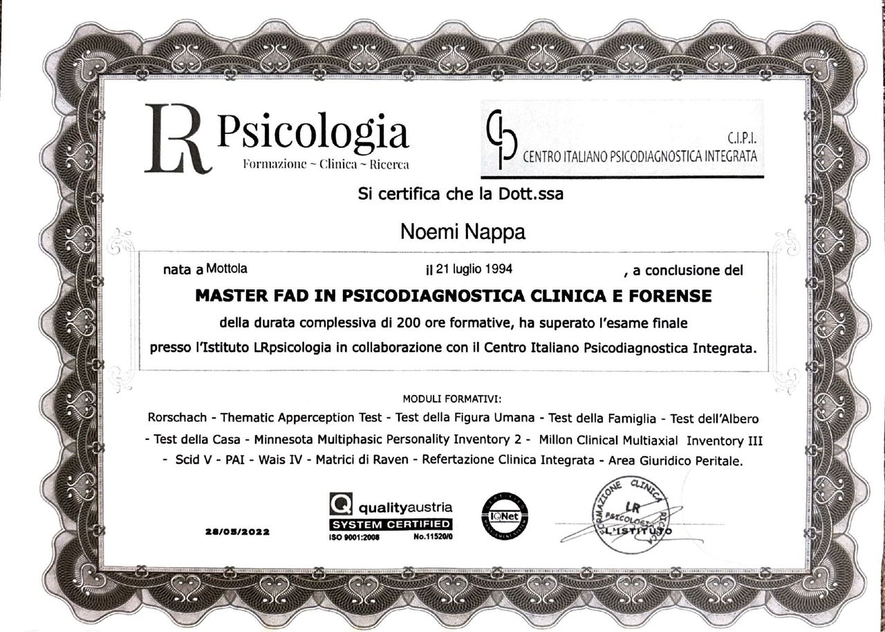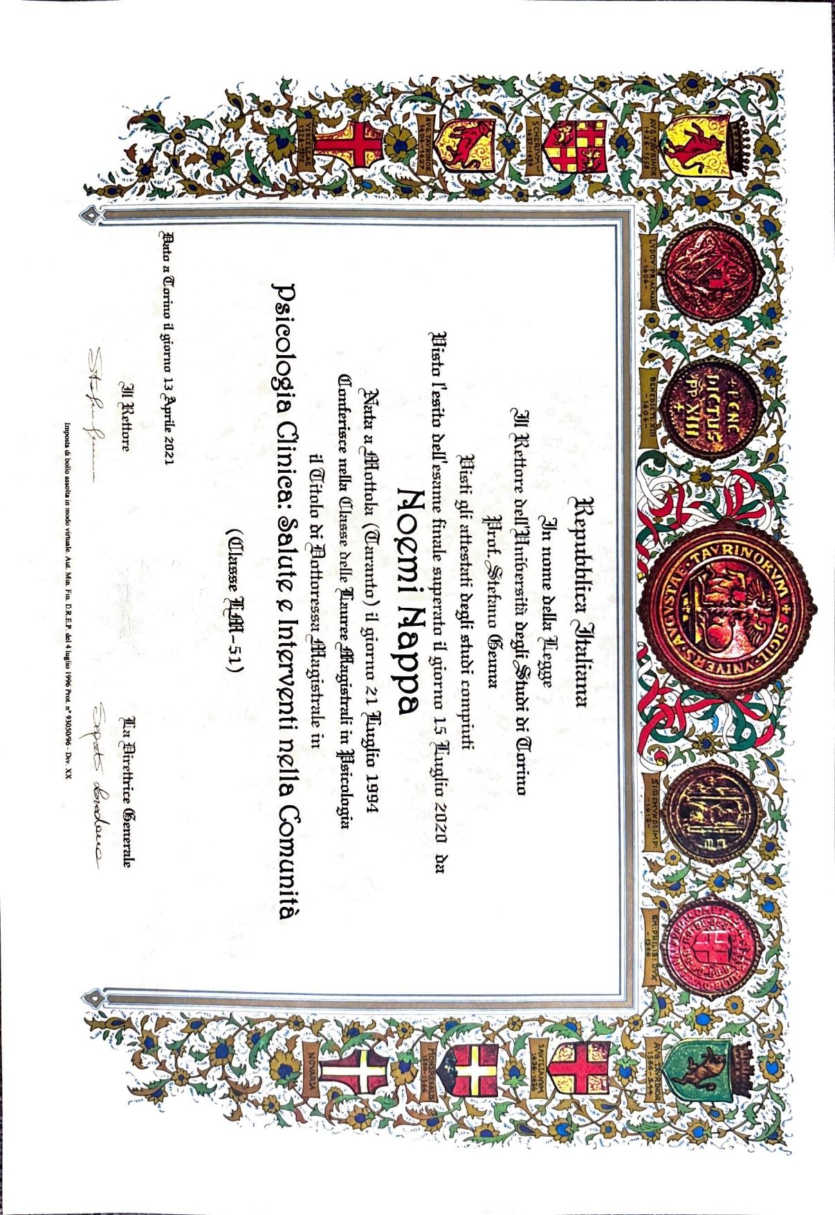 Sono la Dott.ssa Noemi Nappa, Psicologa clinica e Psicoterapeuta in formazione psicoanalitica al quarto ed ultimo anno della Scuola di Psicoterapia Psicoanalitica (SPP) nella sede di Torino. Ho conseguito la laurea magistrale in Psicologia Clinica: salute e interventi nella comunità presso l'Università degli studi di Torino con una votazione di 110/110. Il mio approccio consente, attraverso la costruzione di uno spazio relazionale significativo, di entrare in contatto con il proprio mondo interno ed esplorare le cause consce e inconsce del malessere psicologico, favorendo una più profonda comprensione di sé e del proprio disagio emotivo. La mia priorità è fornire uno spazio accogliente, rispettoso e privo di giudizio alcuno che permetta di costruire una relazione di fiducia in cui potersi sentire a proprio agio. Mi occupo di fornire sostegno psicologico, consulenza individuale e consulenza psicodiagnostica ad adulti e giovani adulti in diversi ambiti quali: - disturbi d'ansia, attacchi di panico; - disagio giovanile (problematiche legate allo studio e contesto universitario); - disturbi del tono dell'umore (depressione, disturbo bipolare); - disturbi di personalità; - difficoltà legate alla sfera emotiva, relazionale e al contesto lavorativo. - difficoltà della sfera identitaria e LGBTQIA+ Ho maturato anni di esperienza nelle dipendenze da sostanze e dipendenze comportamentali (gioco d'azzardo, internet, shopping) in fase emergenziale e in fase di trattamento fino alla fase di reinserimento socio-lavorativo.
