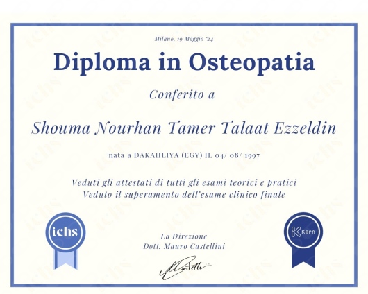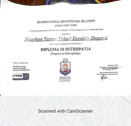 Sono la Dottoressa Nourhan Shouma, Massoterapista (MCB) e Osteopata D.O. (M.R.O.l. 8482), formata presso la prestigiosa l’International Academy of Osteopathy.