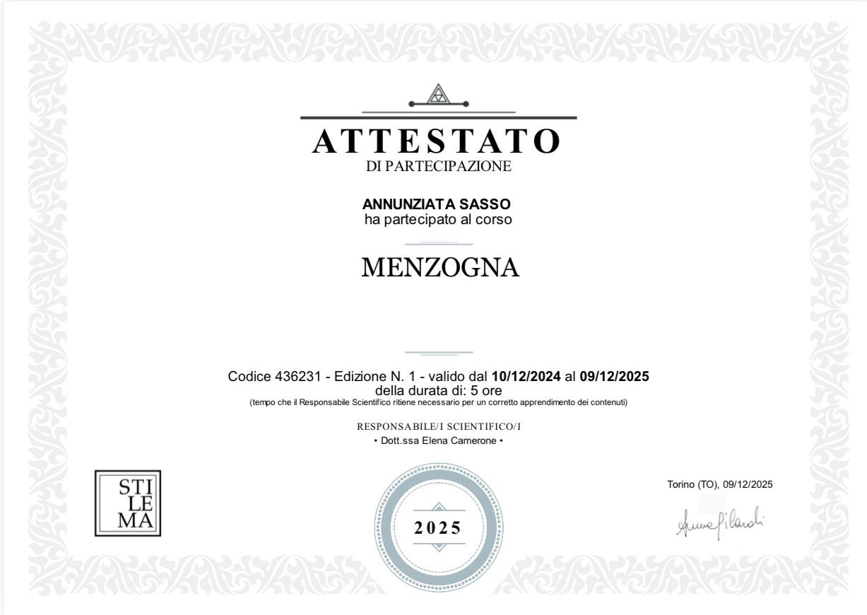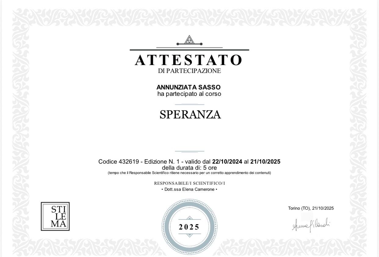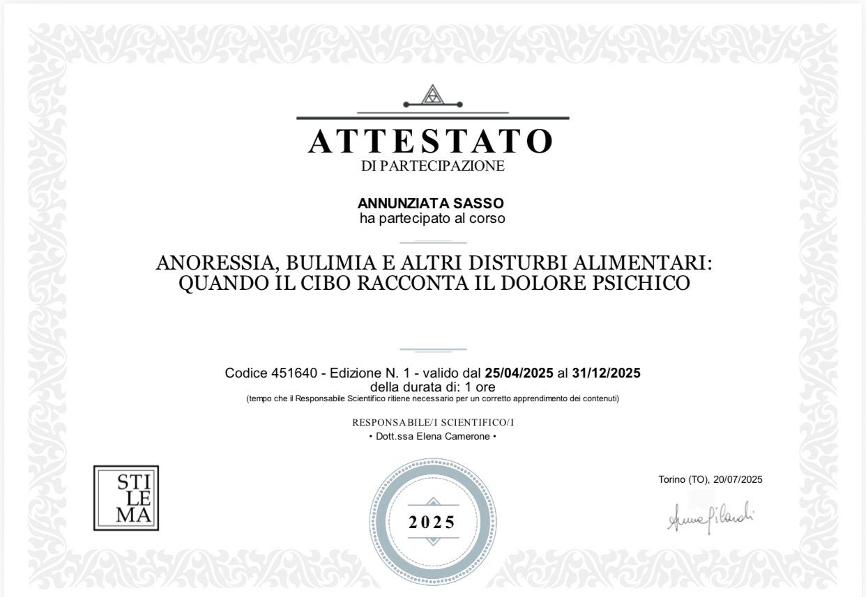 Sono la Dott.ssa Nunzia Sasso, Psicologa e specializzanda in Psicoterapia con approccio integrato Gestalt -sistemico relazionale Neuropsicologico . Accolgo bambini adolescenti e adulti colloquii individuali o coppie in difficoltà che, in momenti di crisi o confusione, cercano un cambiamento autentico che vada oltre la semplice comprensione intellettuale. Il mio impegno è offrirti gli strumenti per trasformare i momenti di vulnerabilità in una forza propulsiva per la tua vita.