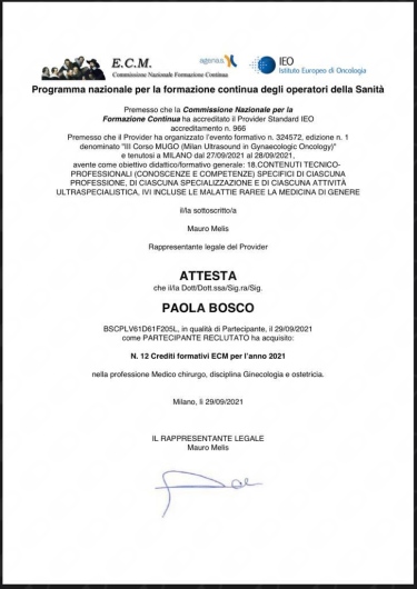 L’attività ospedaliera presso l’Ospedale Melloni ha portato la Dottoressa Bosco ad acquisire diverse competenze in ambito ginecologico: chirurgia ostetrico-ginecologica tradizionale ed endoscopica, gravidanza extrauterina e Ecografie ginecologiche di I e II livello (certificazione IOTA 2016).