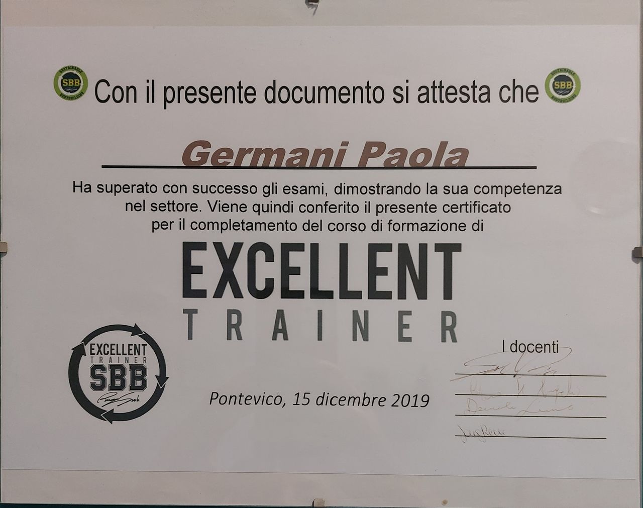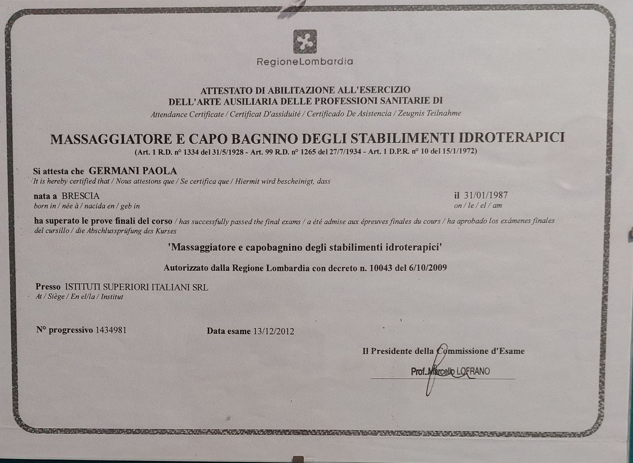Successivamente nel 2012 ho conseguito il diploma di MCB (massaggiatore e capo bagnino degli stabilimenti idroterapici).