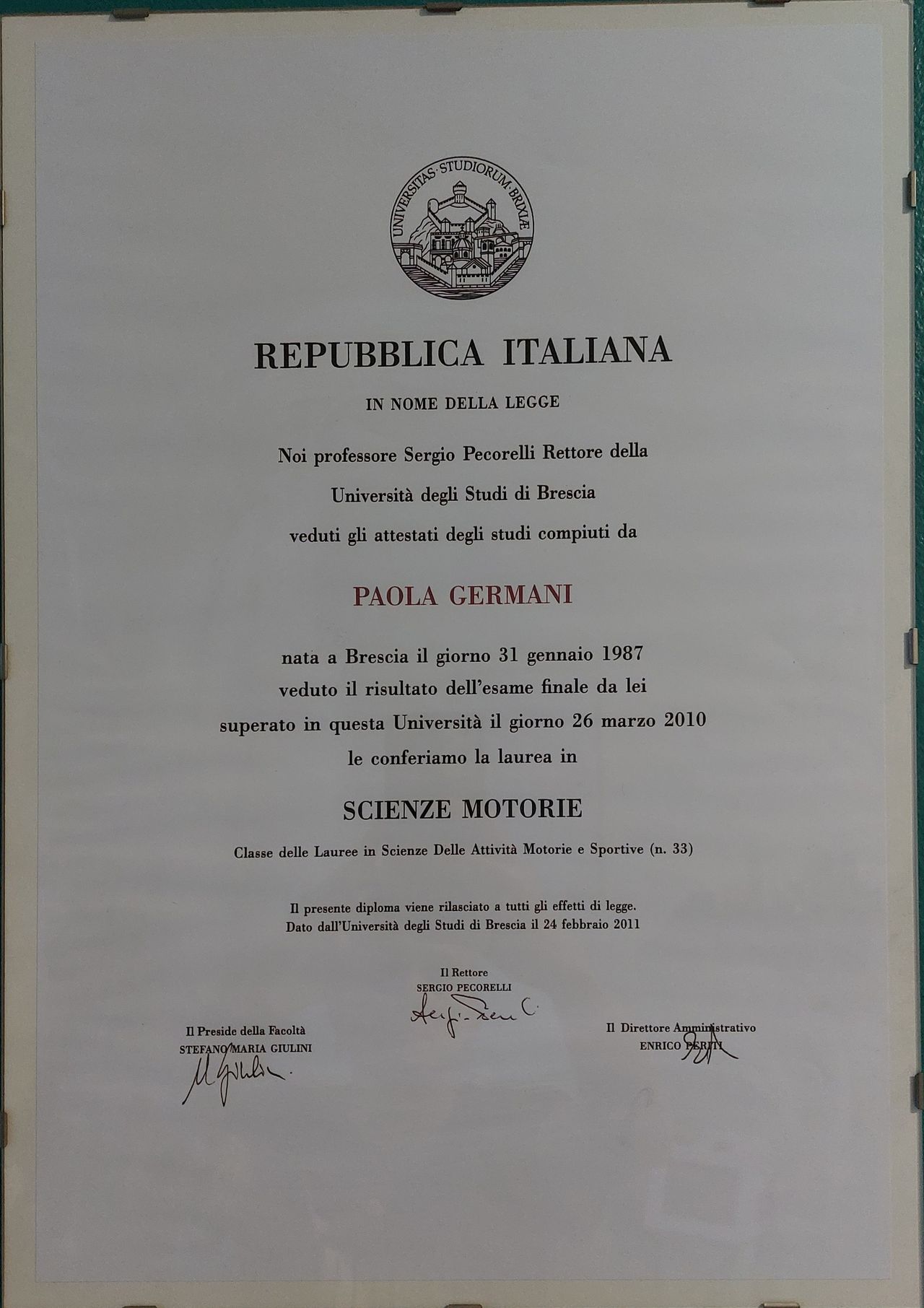 Mi sono laureata in Scienze Motorie nel 2010 a Brescia.