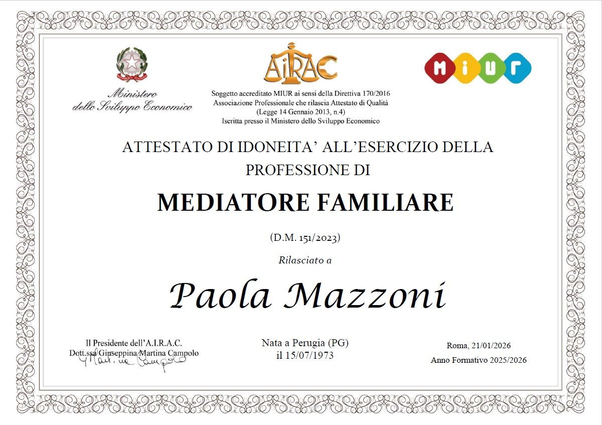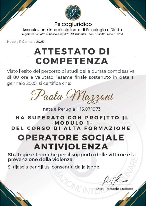 Mi sono rivolta alla Dr. Mazzoni per gestire il mio stato d' animo, parallelamente a un percorso psicoterapeutico necessario a mia figlia, le situazioni a cui andavo incontro e che tutt' ora mi trovo ad affrontare, non riuscivo a gestirle emotivamente per il mio bene e di tutta la mia famiglia La ringrazio infinitamente per l 'ascolto, mirato a fornirmi consigli su come capire ed affrontare ciò che mi accade ciò che provo e come farlo diventare forza e non rabbia o tristezza