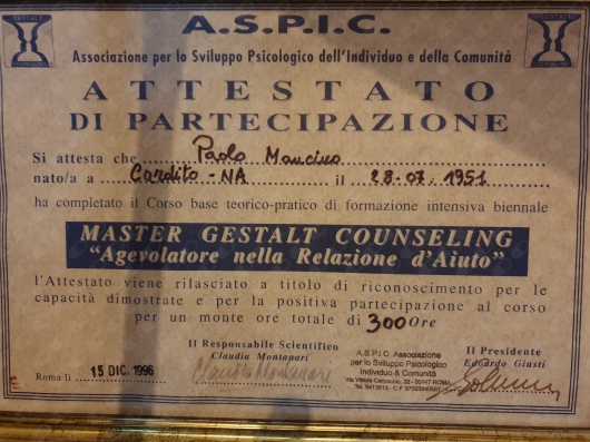 2. Nel 1991 e 92 ho seguito un training completo di psicoterapia personale e didattico della durata di due anni, alla scuola ASPIC di Edoardo Giusti a Roma, alla fine del quale ho conseguito il titolo di Master Gestalt Counseling.