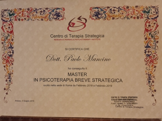 4. Dopo vari studi ed esperienze di psicologia cognitivo-comportamentale e sistemico – relazionale presso il primo policlinico di Napoli e alcuni centri di salute mentale, sono approdato alla scuola di specializzazione di ipnosi clinica ericksoniana ed ho acquisito in seguito, presso il CIICS di Torino il titolo di ipnologo. Ho conseguito il Master in Terapia Strategica Breve presso la scuola di Giorgio Nardone, il CTS di Roma.