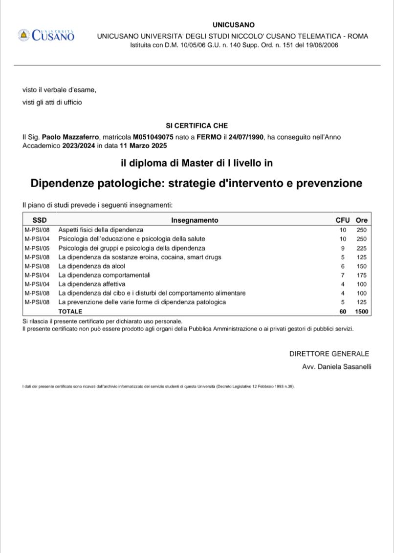 Attualmente svolgo il ruolo di Psicoterapeuta nella comunità per dipendenze patologiche "Dianova", con sede a Montefiore dell'Aso.
