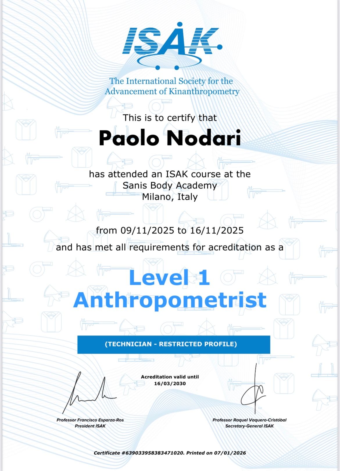 Sono Antropometrista certificato ISAK Level 1 e offro valutazioni complete e approfondite, utili per definire un piano mirato e monitorare i progressi nel tempo in modo preciso e oggettivo.