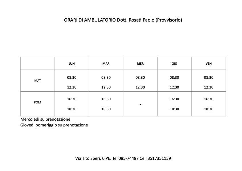 Accesso libero tutti i giorni, su prenotazione mercoledi mattina. Si ricorda ai gentili pazienti che il Mercoledì pomeriggio l'ambulatorio rimarrà chiuso