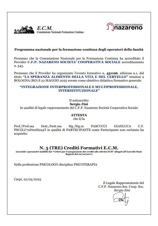 Sono paziente del Dr. Pascucci da circa due anni e mezzo e posso affermare pienamente che il lungo percorso intrapreso insieme ha progressivamente cambiato la mia persona in una direzione positiva e curativa. Le sedute con lui mi hanno permesso di trovare gli strumenti con cui leggermi, interpretarmi e ascoltarmi. In questo modo, grazie a questi colloqui, sono riuscita ad avere una maggiore consapevolezza verso me stessa, verso il rapporto con l' altro e nell' approccio alla vita tout court. Un beneficio in ogni termine. Cristina
