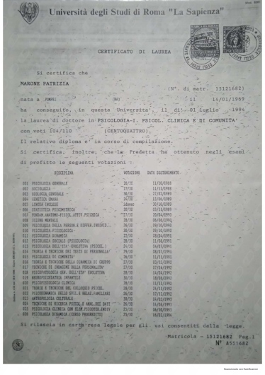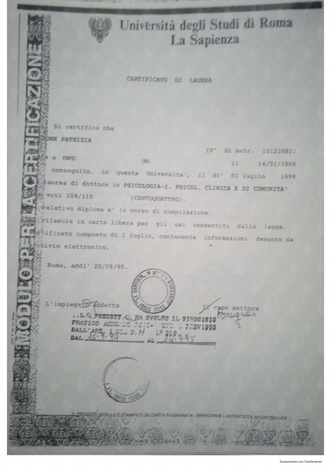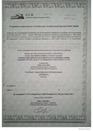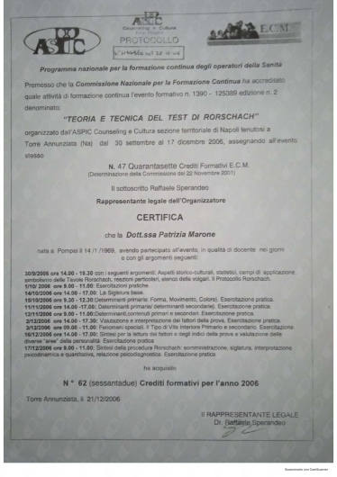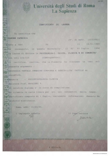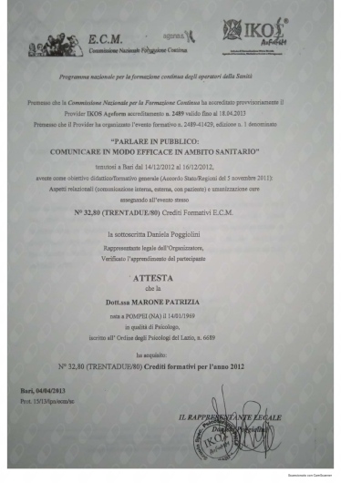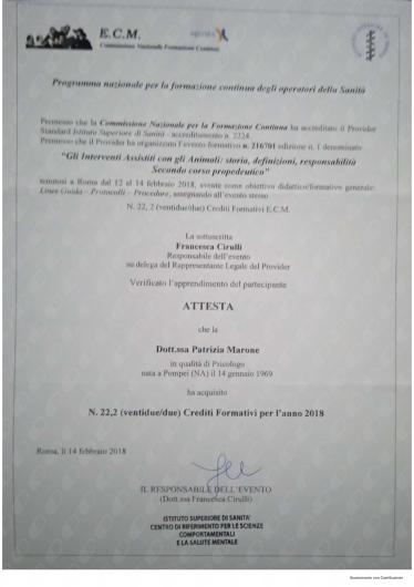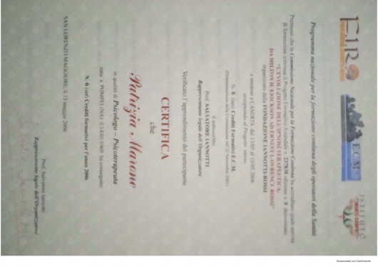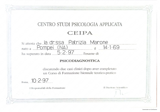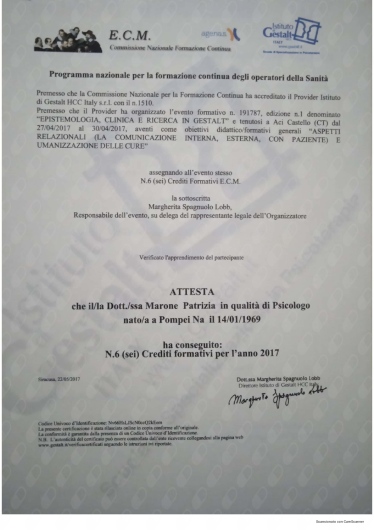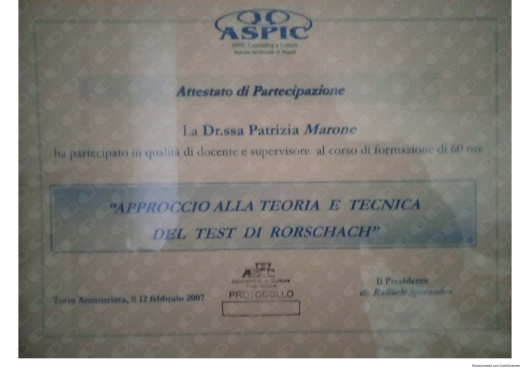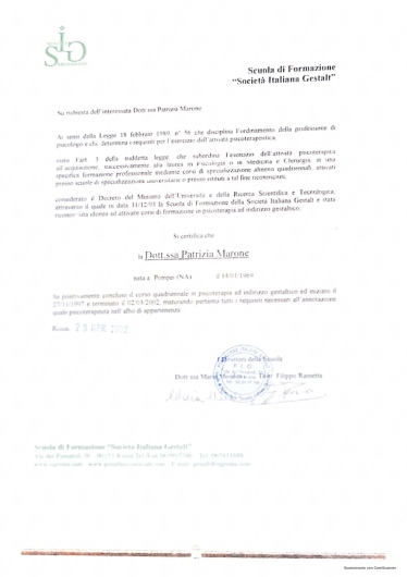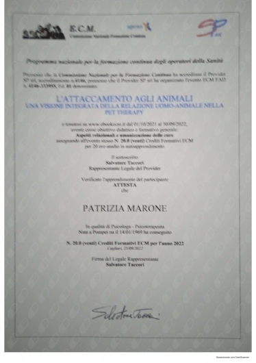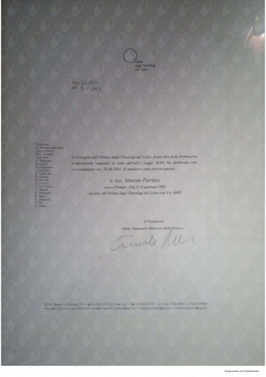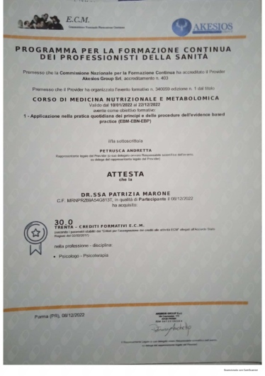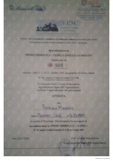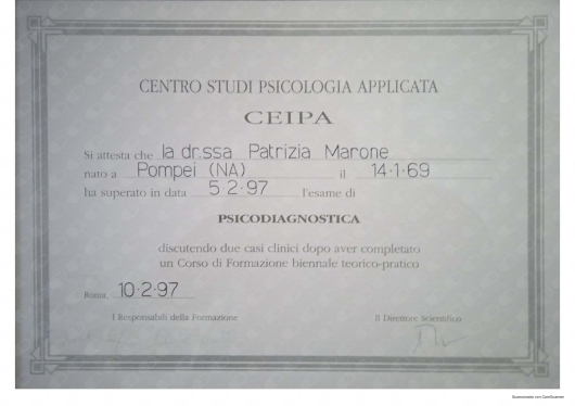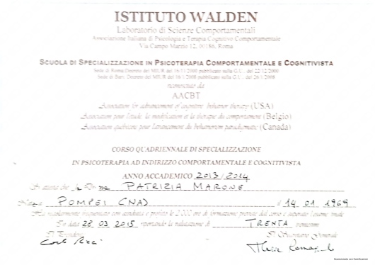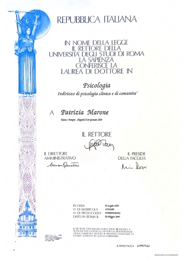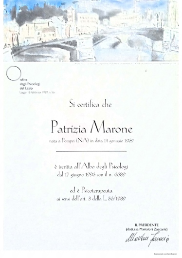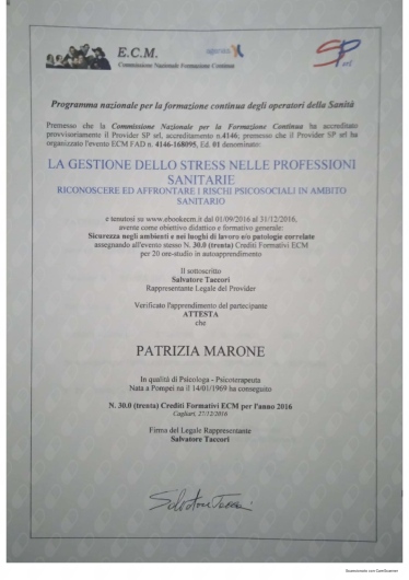Ho conosciuto la dottssa Marone Patrizia ,dopo alcuni eventi molto stressanti e traumatici della mia vita ,iniziando il oercorso di psicoterapia.Sono stata accolta da una grande professionista competente ,attenta e sempre disponibile all' ascolto.La grande professionalità, competenza ed affidabilità denotano la sua grande esperienza nel campo.Le sono molto grata per l'empatia ed il suo impegno che mi hanno aiutato a trovare la strada per raggiungere un nuovo equilibrio .Consiglio vivamente di affidarvi alla professionalità della dottssa Marone per un valido supporto psicologico.
