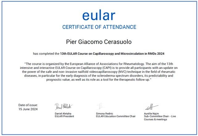 Ho approfondito competenze diagnostiche, tra cui la videocapillaroscopia ungueale, certificata dalla European Alliance of Associations for Rheumatology (EULAR), e competenze terapeutiche, maturando esperienza nell’uso di terapie locoregionali e sistemiche, comprese quelle con farmaci biotecnologici.