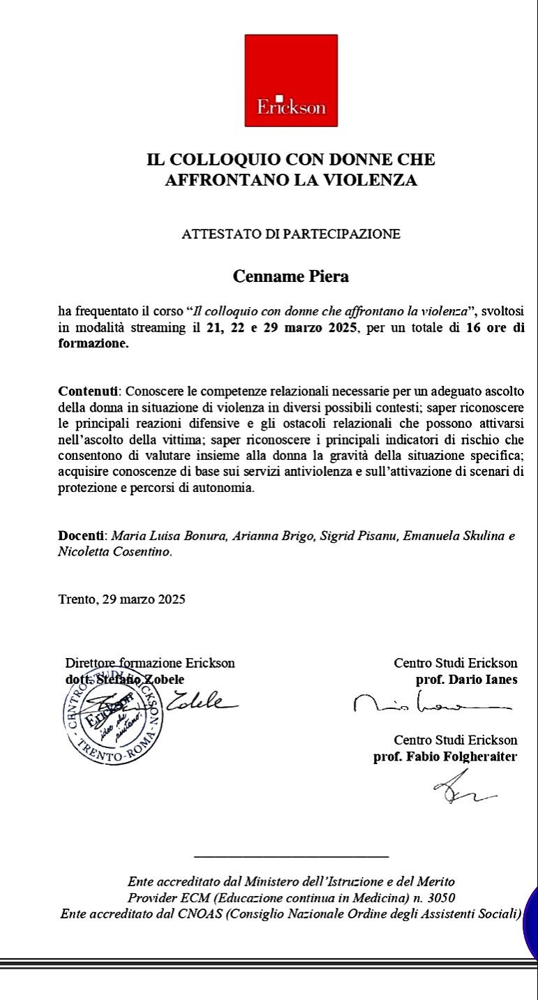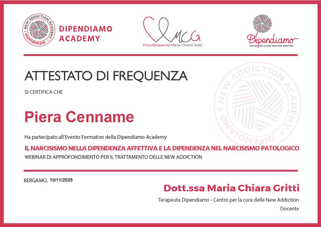 Inoltre mi occupo di dipendenza affettiva in quanto formata presso il Centro Dipendiamo di Bergamo che si occupa di dipendenza a vari livelli e sotto tanti aspetti.