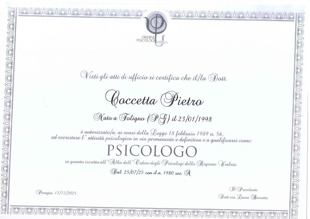 Sono uno psicologo iscritto all’Albo degli Psicologi dell’Umbria (n. 1980). La mia formazione clinica si è sviluppata attraverso tirocini svolti presso l’USL Umbria 2 di Foligno, dove ho avuto l’opportunità di avvicinarmi alla pratica clinica all’interno del Dipartimento dei Disturbi della Nutrizione e dell’Alimentazione, entrando in contatto con una varietà di configurazioni psicopatologiche e con la complessità delle loro manifestazioni soggettive.