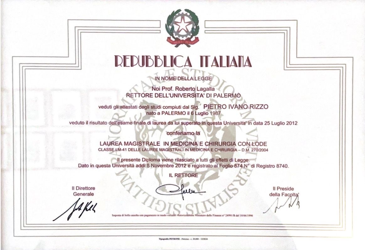 Sono il dott. Pietro Ivano Rizzo, specialista ginecologo, dirigente medico presso U.O.C di Ginecologia e Ostetricia dell' Ospedale Buccheri La Ferla di Palermo. Nasco a Palermo il 06/07/1987, studio Medicina presso l' Università di Palermo e nel 2012 conseguo la laurea in Medicina e Chirurgia con il voto di 110/110 con lode. Mi specializzo in Ginecologia e Ostetricia nel 2018 con il massimo dei voti presso l' Università di Palermo. Durante la mia formazione specialistica mi sono dedicato alle tecniche chirurgiche mini-invasive, per la patologia ginecologica oncologica e benigna; alla diagnosi e cura delle neoplasie ginecologiche; allo studio dell'endometriosi e alla diagnosi prenatale.