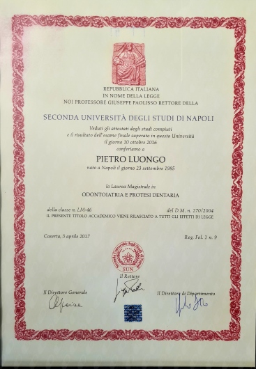 Mi sono laureato in Odontoiatria e Protesi Dentaria presso la Seconda Università degli Studi di Napoli, oggi Università degli Studi della Campania “Luigi Vanvitelli”, dove ho conseguito anche il Master in Implantologia Dentaria.