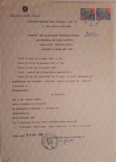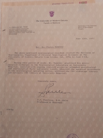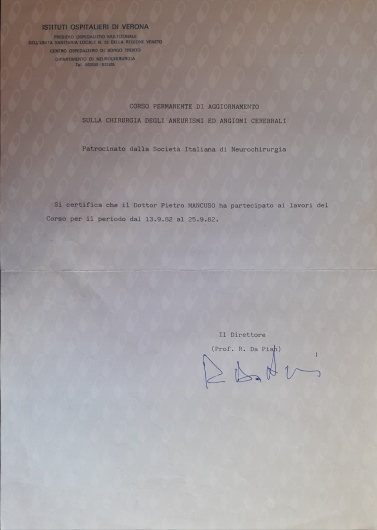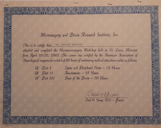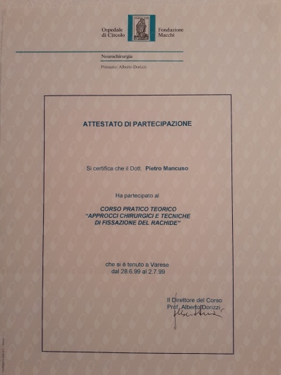 Specialista in neurochirurgia dal 1985 ha completato la propria preparazione frequentando i seguenti centri: - University Hospital, London, Ontario , Canada (1985) - Karolinska Hospital, Stoccolma, Svezia (1987) - Microsurgical Center, University of St. Louis, Missouri, USA. (1988) - Divisione di Neurochirurgia, Università di Hannover , Germania. (1998) Durante circa 40 anni di attività clinica presso strutture ospedaliere (Ospedali "Garibaldi", "Cannizzaro", "Azienda Policlinico-San Marco") sia pubbliche che private ("Villa Salus", "Villa Azzurra") ha operato centinaia di pazienti affetti da patologie neoplastiche, traumatiche, vascolari dell'encefalo e da patologie degenerative, neoplastiche e traumatiche della colonna vertebrale. Ricopre attualmente il ruolo di responsabile dell'Unità Operativa di Neurochirurgia della casa di cura "Villa Azzurra", Siracusa.