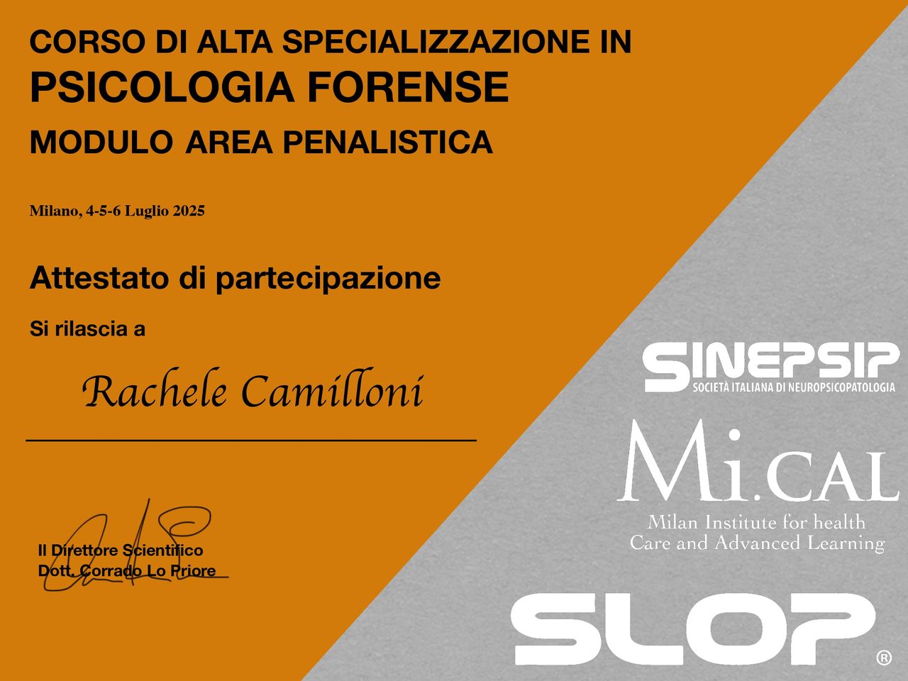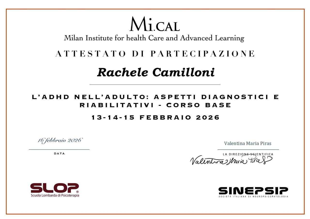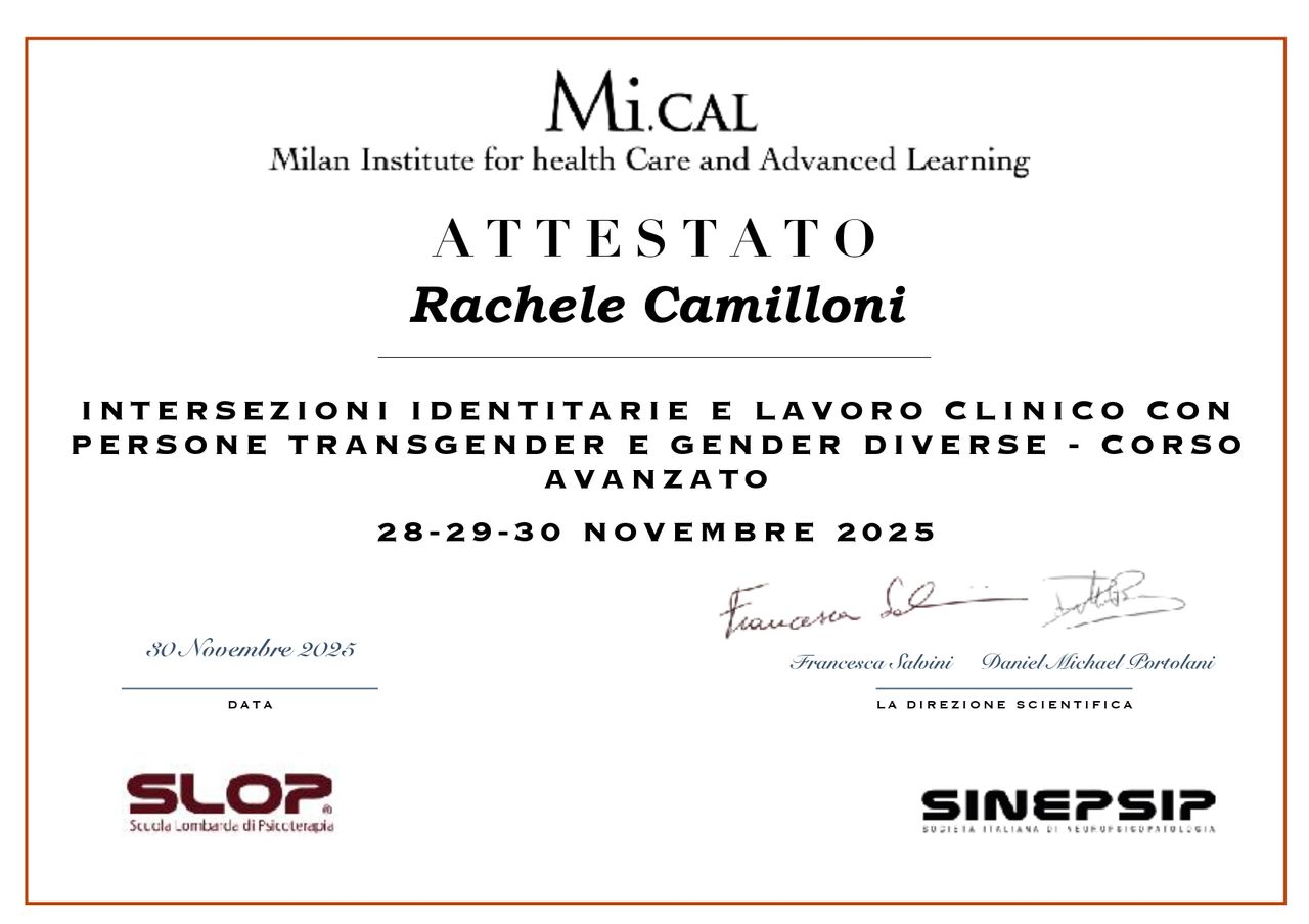 Credo profondamente nell'importanza della formazione continua, per questo a breve inizierò il mio percorso presso la Scuola di Psicoterapia SLOP, con il desiderio di ampliare ulteriormente le mie competenze cliniche