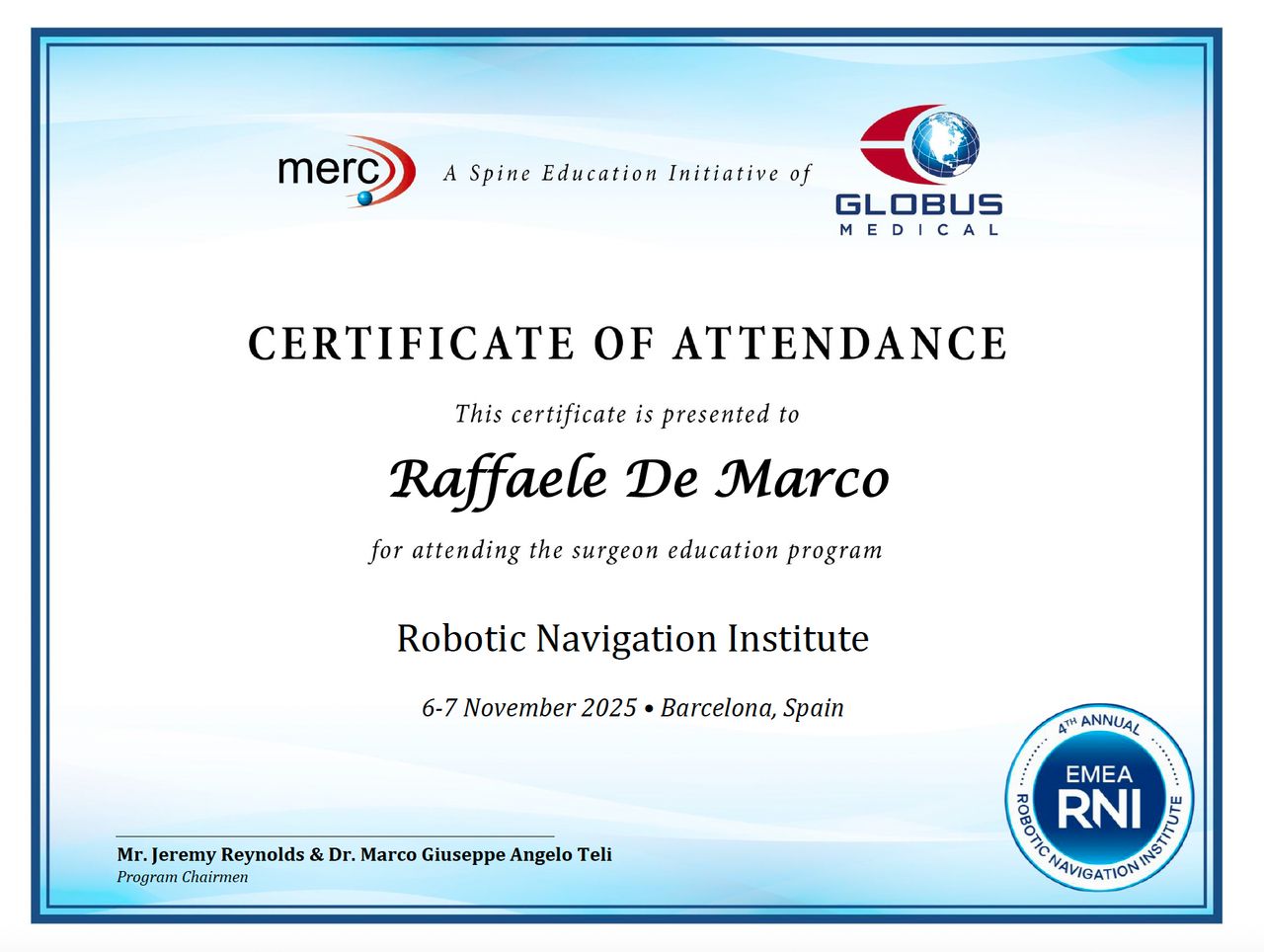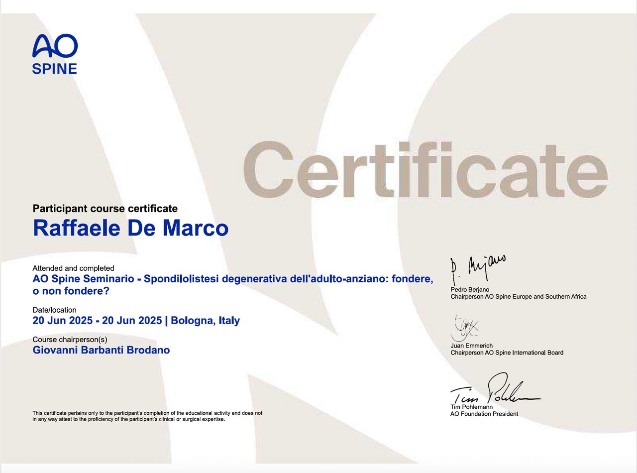 Attualmente lavoro presso l'Unità di Chirurgia Vertebrale Robotica della Clinica Humanitas Gavazzeni, perfezionando la chirurgia mininvasiva della colonna vertebrale in ambito degenerativo, traumatico ed oncologico.