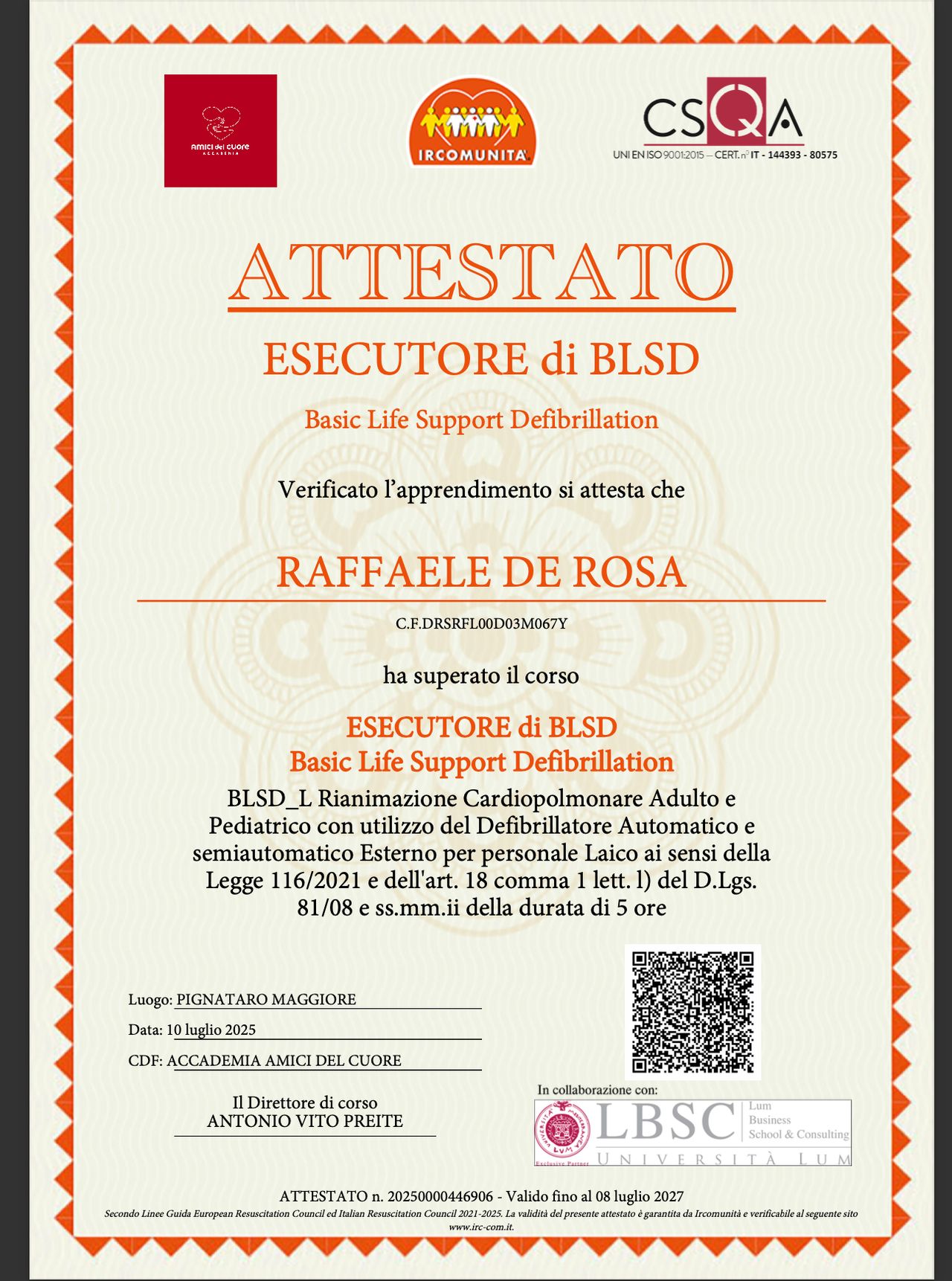• Dottore in Fisioterapia, presso la facoltà di Medicina e Chirurgia dell'Università degli studi della Campania Luigi Vanvitelli.