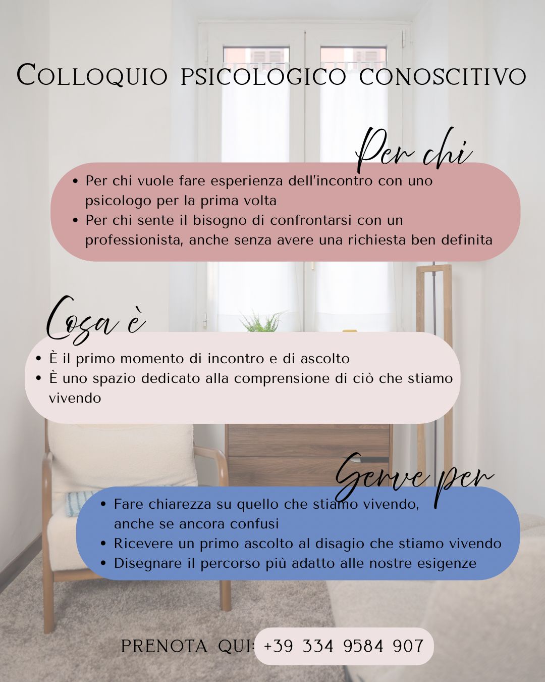 Per ricevere maggiori informazioni e per prenotare un primo colloquio conoscitivo rivolgersi al seguente numero (anche whatsapp): +39 334 9584 907