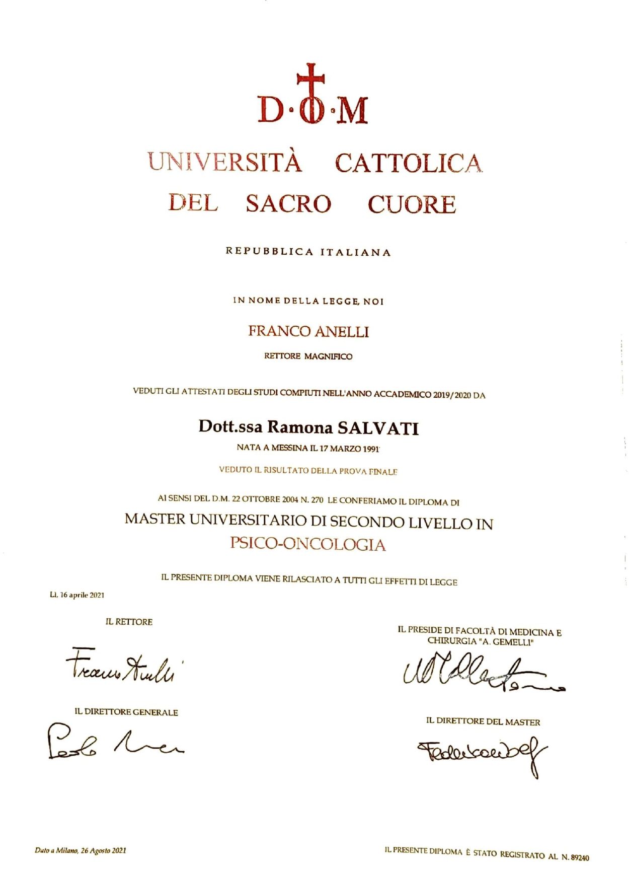 e due di secondo livello di cui uno in Psiconcologia conseguito presso l’Università Cattolica del Sacro Cuore e uno in Gestione delle Risorse Umane conseguito presso la LUMSA.
