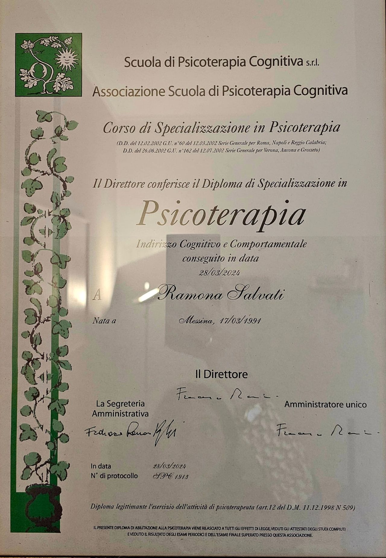 Mi sono abilitata alla professione di Psicologa dopodiché mi sono specializzata in Psicoterapia Cognitivo-Comportamentale presso l'SPC sede di Reggio Calabria.
