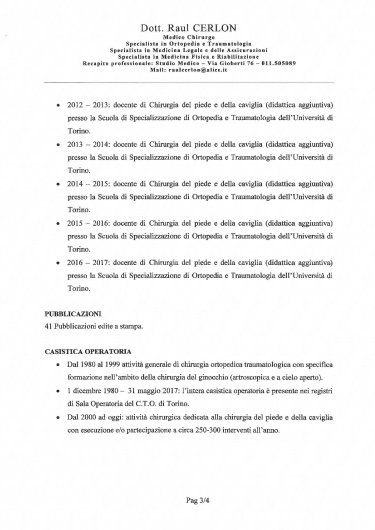 L'anno scorso sono stata operata dal Dottore Cerlon per la correzione dell'alluce valgo. L'operazione e' andata molto bene, sono stata colpita dalle qualita' professionali e umane del Dottore Cerlon. Il Dottore sembra di essere la persona giusta al posto giusto nel senso che e' un medico del corpo e dello spirito- ben preparato, professionale, competente.