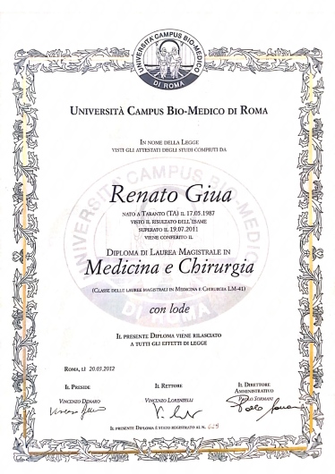 Laureato a pieni voti nel 2011 presso l'Università Campus Bio-Medico di Roma, con tesi di Laurea pubblicata su rivista internazionale, ho proseguito la formazione specialistica nella UOC di Geriatria dello stesso Policlinico, affrontando in modo complessivo le patologie dell'anziano, dal deterioramento cognitivo e i disturbi comportamentali alla gestione delle patologie infettive e della fragilità. Durante la formazione specialistica, ho proseguito, inoltre, una formazione specifica nelle malattie dell'apparato respiratorio, con attività già dal 2012 presso la subintensiva pneumologica del Policlinico Campus Bio-Medico, degli ambulatori di pneumologia e della sezione di endoscopia toracica.