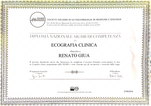 Durante la specializzazione ho ottenuto il diploma di ecografia internistica della Società Italiana di Ultrasonologia in Medicina e Biologia (SIUMB), dopo superamento di corso pratico (svolto presso il Policlinico "A. Gemelli" di Roma) ed esame teorico.
