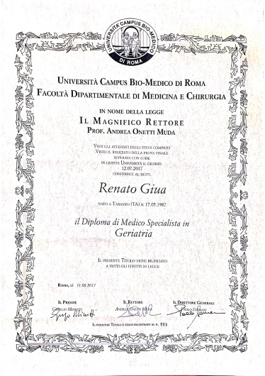 Mi sono specializzato nel 2017 presso l'Università Campus Bio-Medico di Roma, con tesi di specializzazione pubblicata su rivista internazionale e numerose pubblicazioni all'attivo, su riviste internazionali indicizzate, sia in ambito pneumologico che geriatrico.