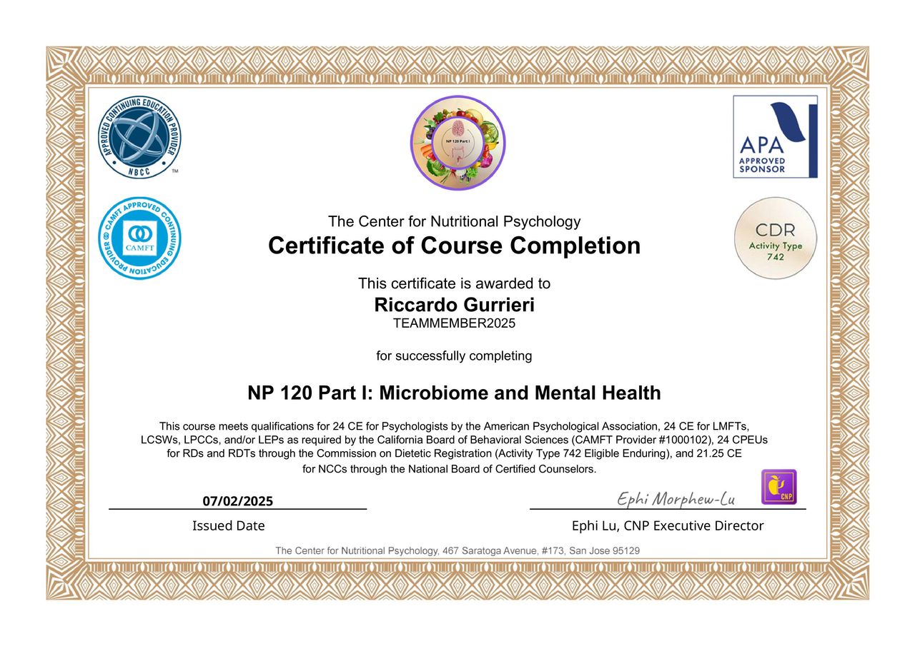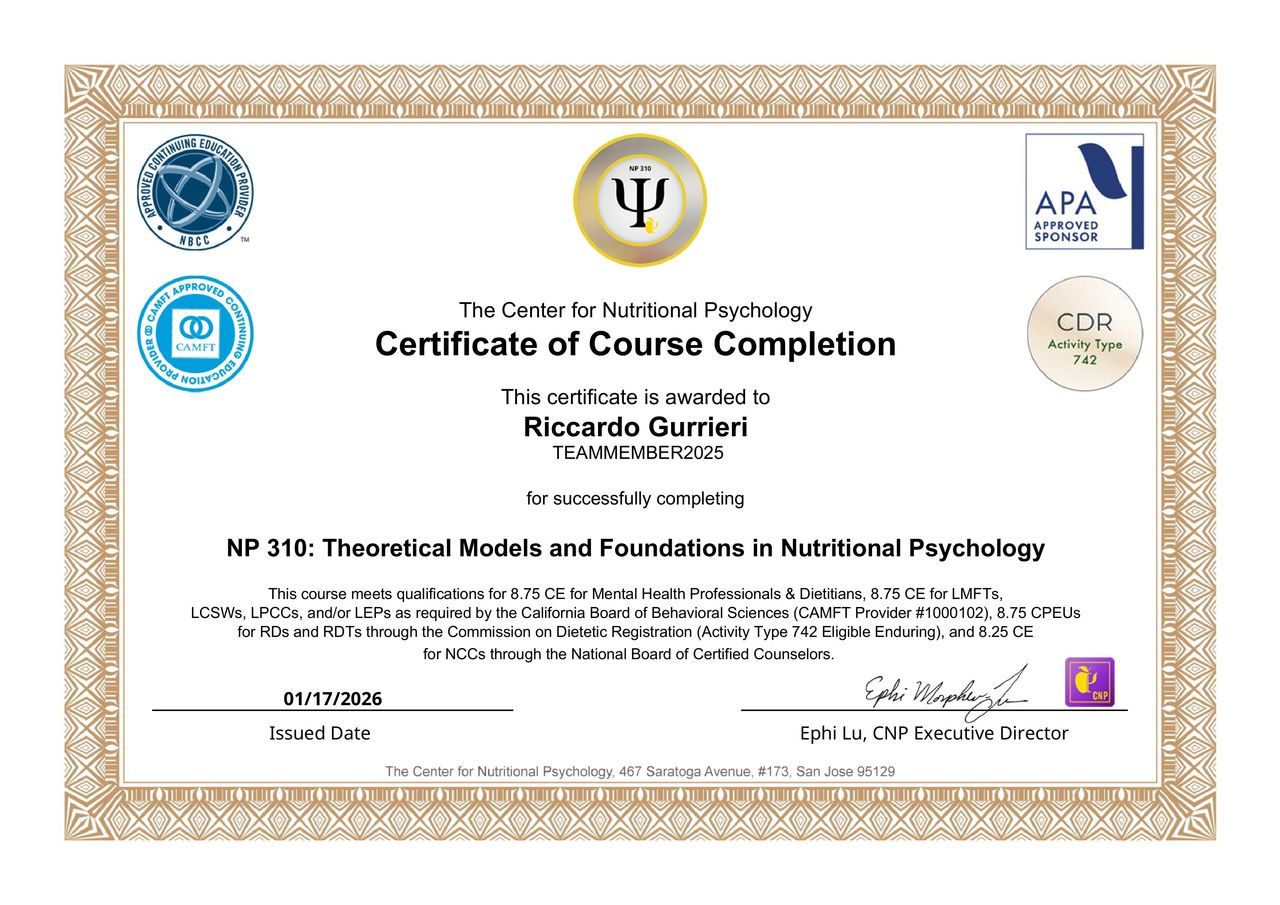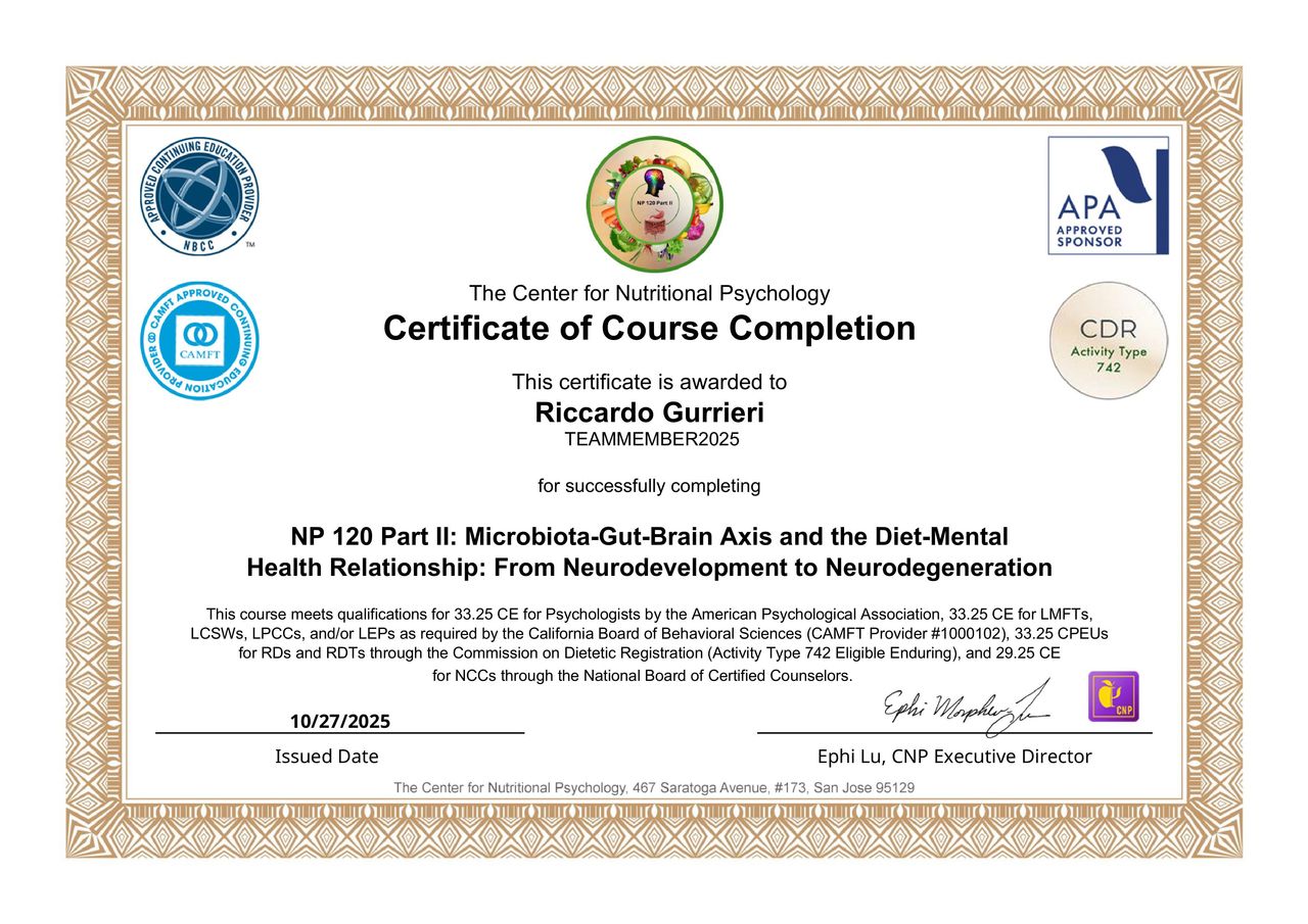 Ho conseguito un Master in Nutrizione e Dietetica Applicata e un Corso di Alta Formazione in Neuropsicologia, che mi consentono di offrire percorsi integrati basati su evidenze scientifiche aggiornate.