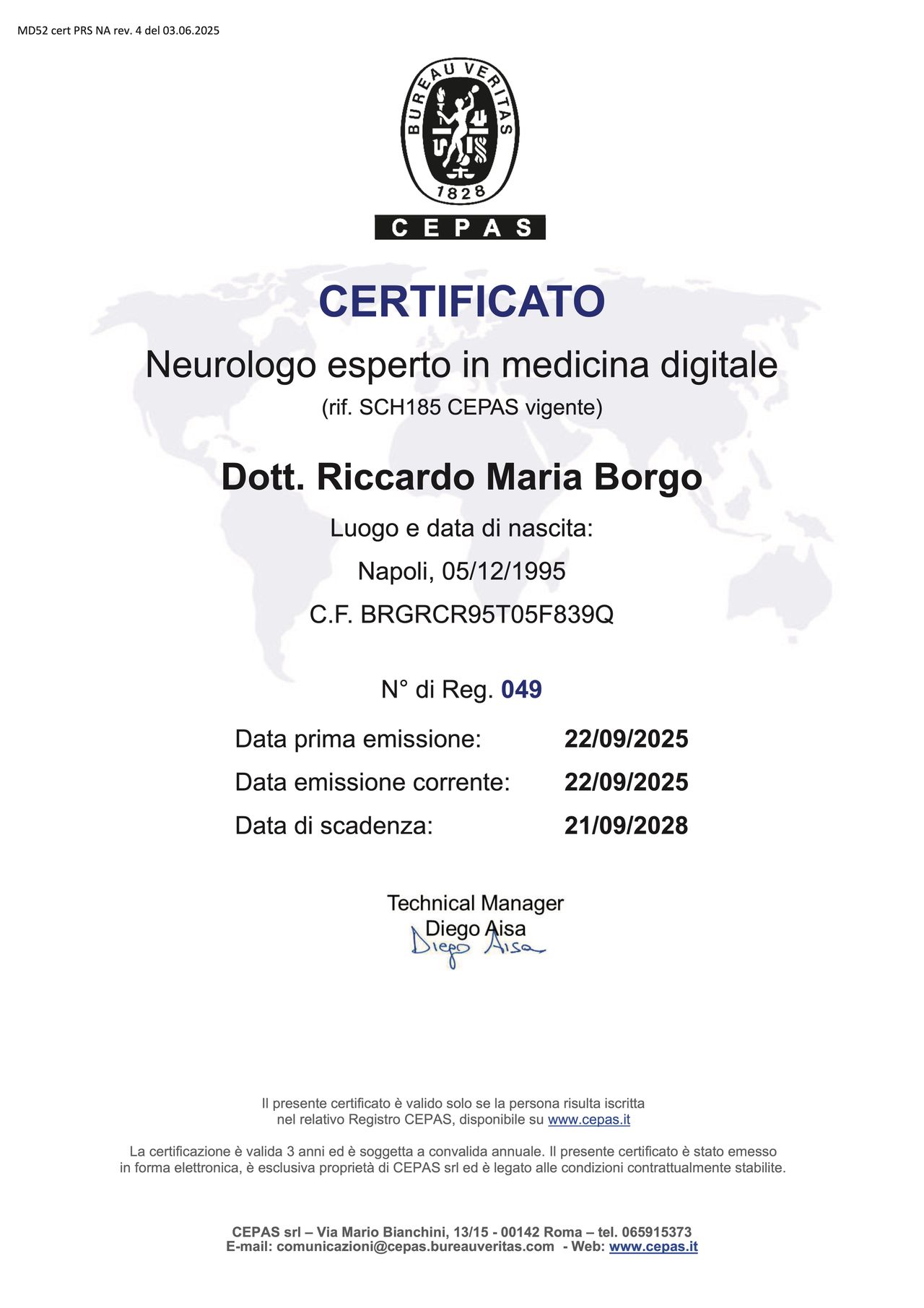 Sono inoltre in possesso della certificazione come neurologo esperto in medicina digitale, che attesta competenze specifiche nell’utilizzo consapevole delle tecnologie digitali e dei dati clinici a supporto della pratica neurologica.