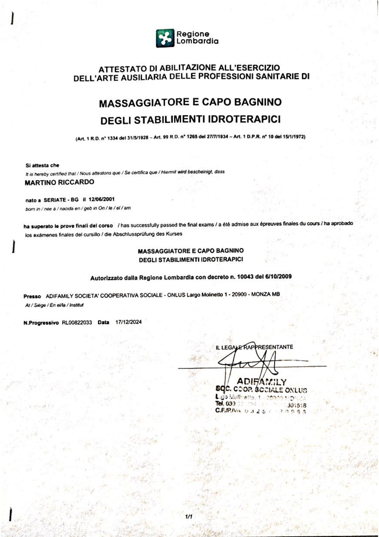 Sono il Dr. Riccardo Martino massoterapista. Ho il titolo conseguito presso istituto ADI FAMILY a Monza e un master in coppettazione clinica.